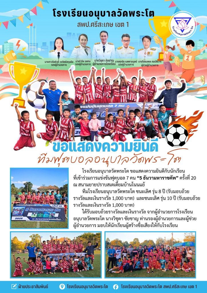 ขอแสดงความยินดีกับนักกีฬาฟุตบอลทีมโรงเรียนอนุบาลวัดพระโต ที่ได้รับรางวัลชนะเลิศ 5 ธันวามหาราชคัพ ครั้งที่ 20