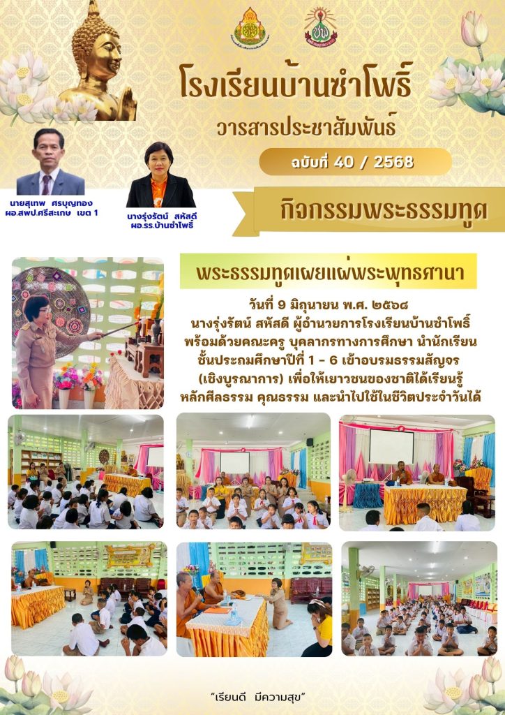 ในการนี้ได้มีการรับมอบ เบาะรองนั่งสมาธิ โดย พระวชิรสิทธิธาดา เจ้าคณะจังหวัดศรีสะเกษ เจ้าอาวาส วัดมหาพุทธารามพระอารามหลวง จำนวน ๑๒๐ ผืน มูลค่า ๑๒,๐๐๐ บาท นอกจากนี้พระอธิการสุพิษ สุภัทโท ร่วมบริจาคเงินสนับสนุนการจัดการศึกษาโรงเรียนบ้านซำโพธิ์ จำนวนเงิน ๕,๐๐๐ บาท โดยมี ผอ.อุดม โพธิ์ชัย อกคศ.สพป.ศรีสะเกษเขต ๑ นางรุ่งรัตน์ สหัสดี ผู้อำนวยการโรงเรียนบ้านซำโพธิ์ นางกนกอร เบียดนอก ผู้อำนวยการโรงเรียนบ้านหนองสวง นายพิทักษ์ พันธ์จันทร์ ผู้อำนวยการโรงเรียนบ้านกุดโง้ง (สิริราษฎร์บำรุง) นายวรัญญู จันทร์ละออ ผู้อำนวยการโรงพยาบาลส่งเสริมสุขภาพตำบลบ้านแทง นายสีทอง ปัญญาคม ประธานกรรมการสถานศึกษาขั้นพื้นฐาน นายพรชัย สุทาบุญ รองประธานกรรมการสถานศึกษาขั้นพื้นฐาน คณะกรรมการ คณะที่ปรึกษา ผู้ปกครอง ชุมชน ศิษย์เก่า และนักเรียนโรงเรียนบ้านซำโพธิ์ เข้าร่วมร่วมกิจกรรม