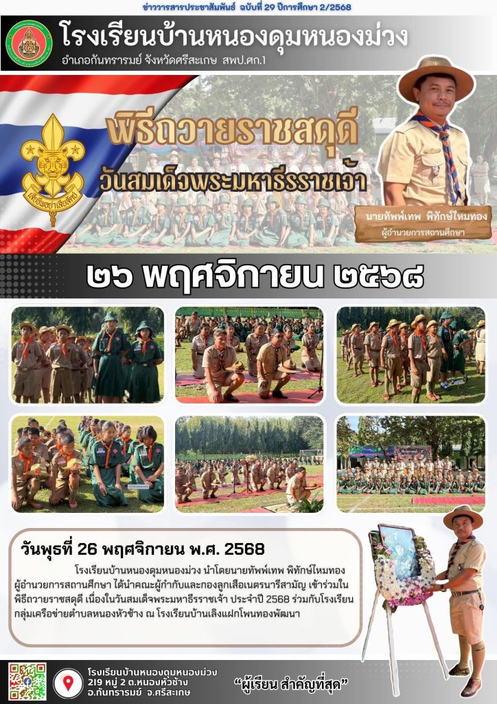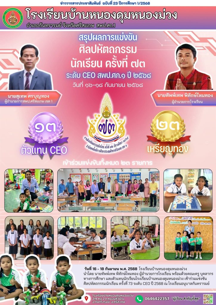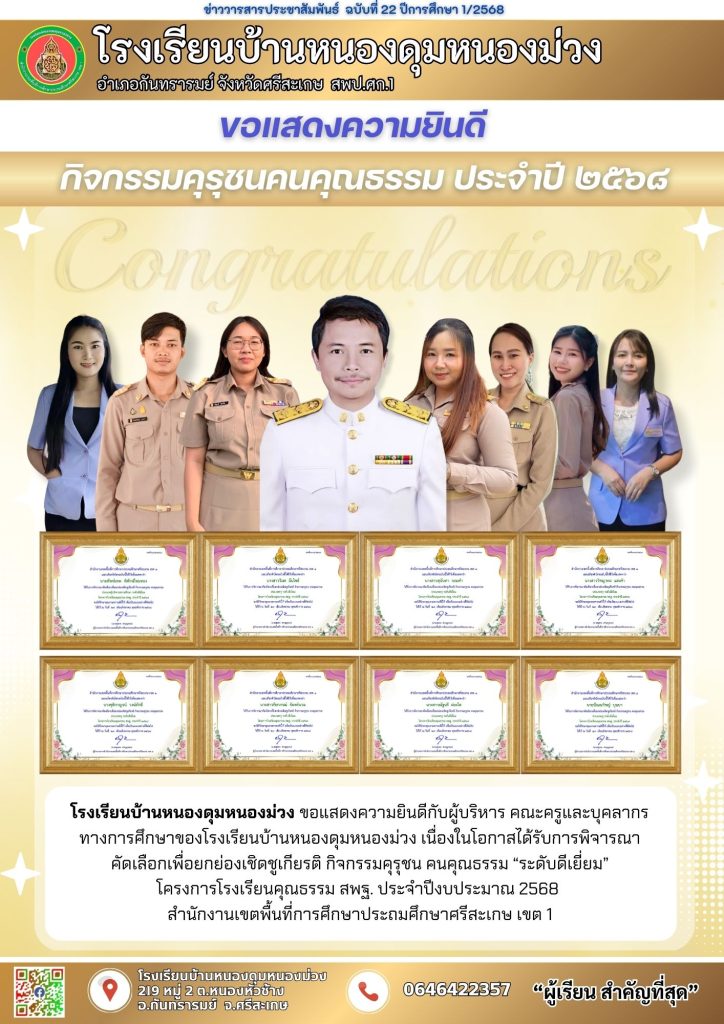 รร.บ้านหนองดุมหนองม่วง ขอแสดงความยินดีกับผู้บริหารและคณะครู ที่ได้รับการพิจารณายกย่องเชิดชูเกียรติ กิจกรรมคุรุชน คนคุณธรรม ประจำปี 2568