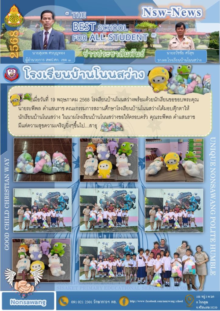 วันศุกร์ ที่ 14 เดือนมีนาคม  พ.ศ.2568 โรงเรียนบ้านโนนสว่าง นำโดยนายธวัชชัย ศรีสุข รักษาการในตำแหน่งผู้อำนวยการโรงเรียนบ้านโนนสว่าง ได้ดำเนินการจัดกิจกรรมวันปัจฉิมนิเทศให้กับนักเรียนระดับชั้นป.6 อีกทั้งยังเป็นการปลูกฝังให้นักเรียนเกิดความตระหนัก รัก และภูมิใจในสถาบันที่ตนเองศึกษา ทางโรงเรียนขอแสดงความชื่นชม ยินดีกับนักเรียนทุกคนที่กำลังจะสำเร็จการศึกษาและก้าวเดินไปข้างหน้าต่อไป