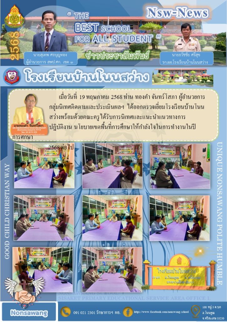 เมื่อวันที่ 19 พฤษภาคม 2568 ท่าน ทองคำ จันทร์โสภา ผู้อำนวยการกลุ่มนิเทศติดตามและประเมินผลฯ ได้ออกตรวจเยี่ยมโรงเรียนบ้านโนน สว่างพร้อมด้วยคณะครูได้รับการนิเทศและแนะนำแนวทางการปฏิบัติงาน นโยบายเขตพื้นที่การศึกษาให้กำลังใจในการทำงานในปีการศึกษา2568 ต่อไป