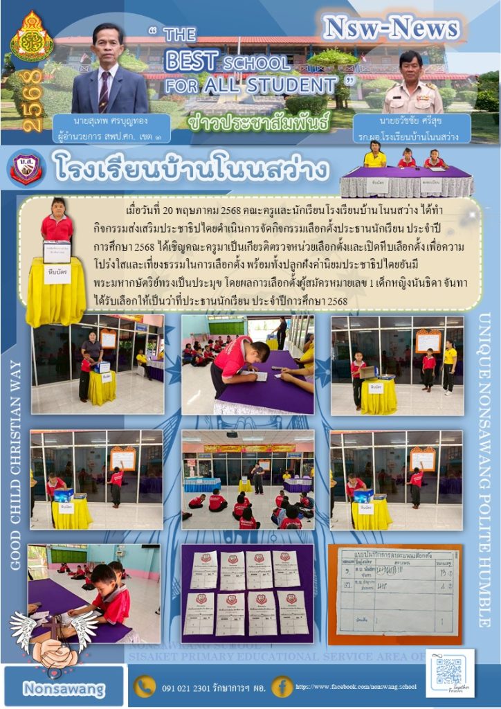 เมื่อวันที่ 20 พฤษภาคม 2568 คณะครูและนักเรียนโรงเรียนบ้านโนนสว่าง ได้ทำ  กิจกรรมส่งเสริมประชาธิปไตยดำเนินการจัดกิจกรรมเลือกตั้งประธานนักเรียน ประจำปี  การศึกษา 2568 ได้เชิญคณะครูมาเป็นเกียรติตรวจหน่วยเลือกตั้งและเปิดหีบเลือกตั้ง เพื่อความ  โปร่งใสและเที่ยงธรรมในการเลือกตั้ง พร้อมทั้งปลูกฝังค่านิยมประชาธิปไตยอันมี  พระมหากษัตริย์ทรงเป็นประมุข โดยผลการเลือกตั้งผู้สมัครหมายเลข 1 เด็กหญิงนันธิดา จันทา   ได้รับเลือกให้เป็นว่าที่ประธานนักเรียน ประจำปีการศึกษา 2568