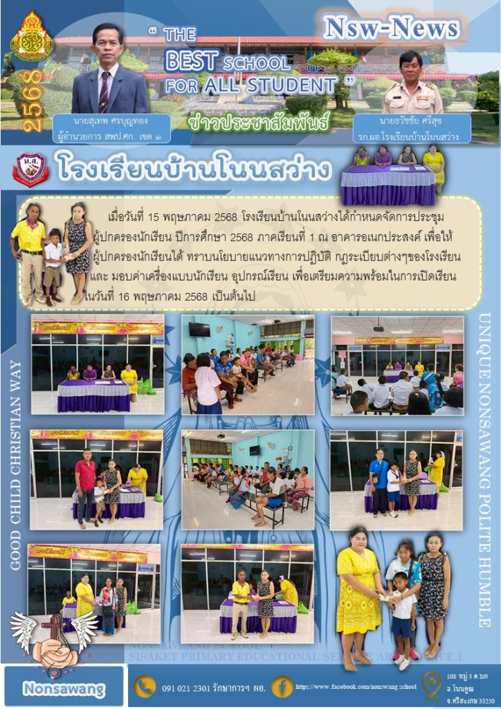 เมื่อวันที่ 15 พฤษภาคม 2568 โรงเรียนบ้านโนนสว่างได้กำหนดจัดการประชุมผู้ปกครองนักเรียน ปีการศึกษา 2568 ภาคเรียนที่ 1 ณ อาคารอเนกประสงค์ เพื่อให้ผู้ปกครองนักเรียนได้ ทราบนโยบายแนวทางการปฏิบัติ กฎระเบียบต่างๆของโรงเรียนและ มอบค่าเครื่องแบบนักเรียน อุปกรณ์เรียน เพื่อเตรียมความพร้อมในการเปิดเรียนในวันที่ 16 พฤษภาคม 2568 เป็นต้นไป