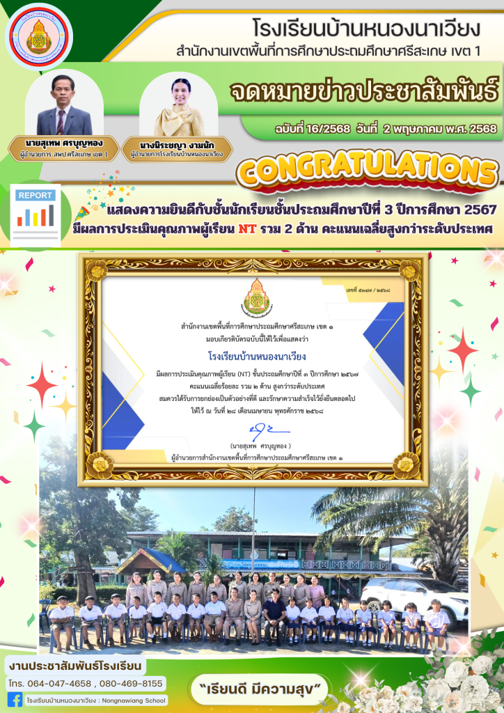 วันที่ ๘ พฤศจิกายน ๒๕๖๗ โรงเรียนบ้านหนองนาเวียง โดยนางนิระชญา งามนัก ผู้อำนวยการโรงเรียน พร้อมด้วยคณครู บุคลากร เป็นเจ้าภาพกองกฐินครู นักเรียน ผู้ปกครองโรงเรียนบ้านหนองนาเวียง ได้รวบรวมปัจจัยสร้างบุญกุศคล จำนวนเงิน ๔,๔๔๔ บาท เพื่อร่วมทอดถวายในงานบุญกฐินสามัคคี วัดหนองนาเวียง ประจำปี ๒๕๖๗ โดยมีวัตถุประสงค์เพื่อสมทบทุนสร้างรั้วสแตนเลสรอบศาลาการเปรียญ มีพิธีทอดถวายในวันที่ ๘ พฤศจิกายน ๒๕๖๗