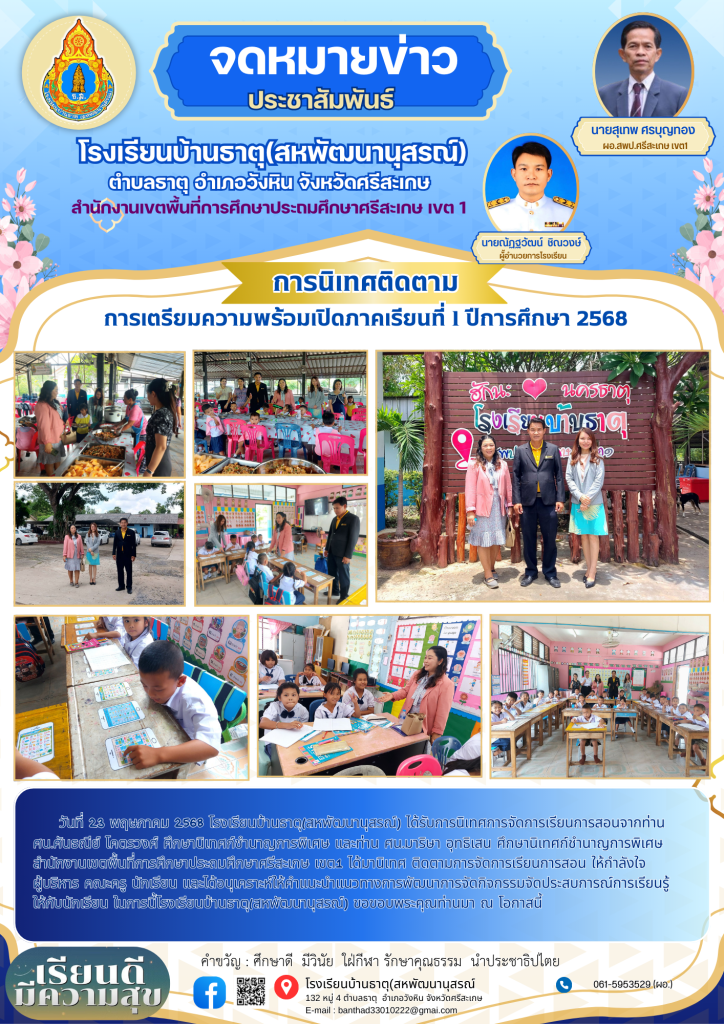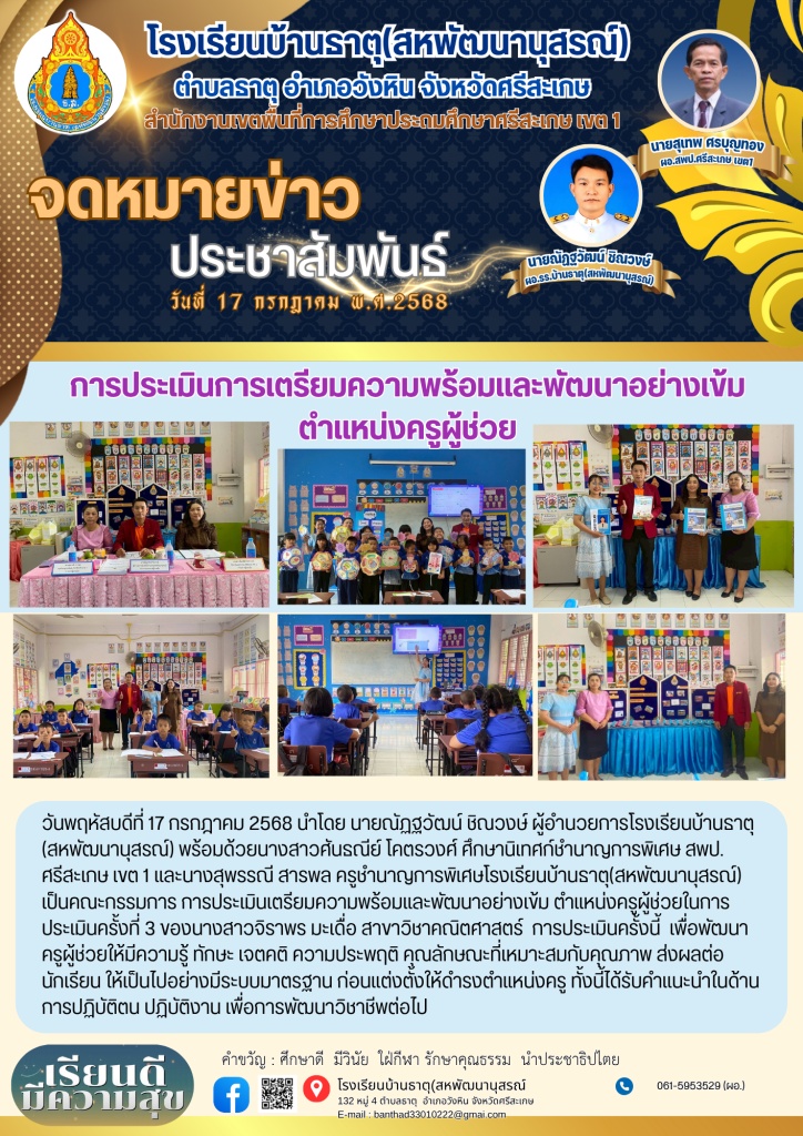 วันพฤหัสบดีที่ 17 กรกฎาคม 2568 นำโดย นายณัฏฐวัฒน์ ชิณวงษ์ ผู้อำนวยการโรงเรียนบ้านธาตุ (สหพัฒนานุสรณ์) พร้อมด้วยนางสาวศันธณีย์ โคตรวงศ์ ศึกษานิเทศก์ชำนาญการพิเศษ สพป. ศรีสะเกษ เขต 1 และนางสุพรรณี สารพล ครูชำนาญการพิเศษโรงเรียนบ้านธาตุ(สหพัฒนานุสรณ์) เป็นคณะกรรมการ การประเมินเตรียมความพร้อมและพัฒนาอย่างเข้ม ตำแหน่งครูผู้ช่วยในการประเมินครั้งที่ 3 ของนางสาวจิราพร มะเดื่อ สาขาวิชาคณิตศาสตร์ การประเมินครั้งนี้ เพื่อพัฒนาครูผู้ช่วยให้มีความรู้ ทักษะ เจตคติ ความประพฤติ คุณลักษณะที่เหมาะสมกับคุณภาพ ส่งผลต่อนักเรียน ให้เป็นไปอย่างมีระบบมาตรฐาน ก่อนแต่งตั้งให้ดำรงตำแหน่งครู ทั้งนี้ได้รับคำแนะนำในด้านการปฏิบัติตน ปฏิบัติงาน เพื่อการพัฒนาวิชาชีพต่อไป