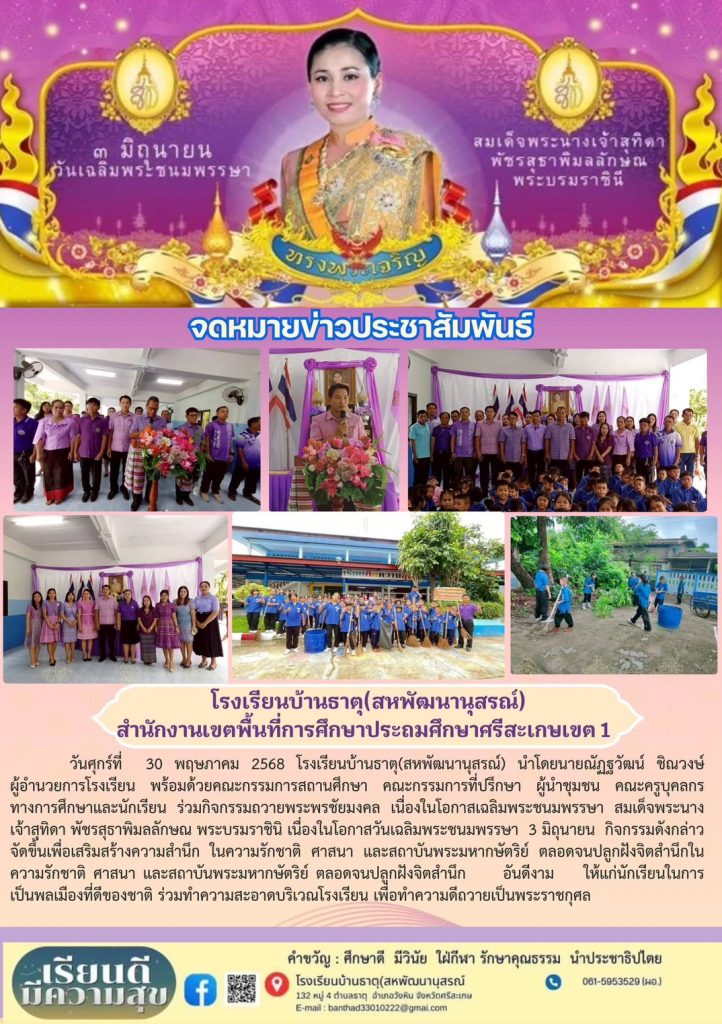 วันที่ 24 กรกฎาคม 2568 นำโดยนายณัฎฐวัฒน์ ชิณวงษ์ ผู้อำนวยการโรงเรียนบ้านธาตุ(สหพัฒนานุสรณ์) พร้อมทั้งคณะครูและบุคลากรทางการศึกษา ได้จัดพิธีถวายพระพรชัยมงคล และถวายสัตย์ปฏิญาณเพื่อเป็นข้าราชการที่ดีและพลังของแผ่นดิน และร่วมลงนามถวายพระพร เพื่อเป็นการถวายความจงรักภักดีและสำนึกในพระมหากรุณาธิคุณ เนื่องในโอกาสพระราชพิธีมหามงคลเฉลิมพระชนมพรรษา 73 พรรษา วันที่ 28 กรกฎาคม 2568 และได้นำนักเรียนร่วมทำกิจกรรมบำเพ็ญประโยชน์ ณ โรงเรียนบ้านธาตุ(สหพัฒนานุสรณ์)