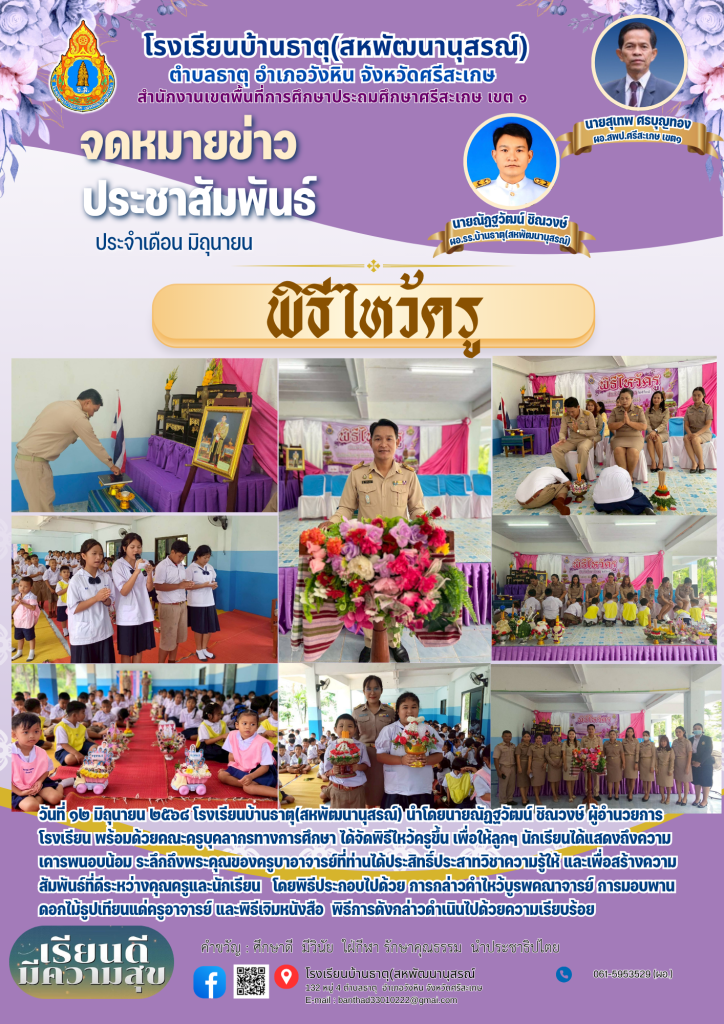 วันที่ ๑๒ มิถุนายน ๒๕๖๘ โรงเรียนบ้านธาตุ(สหพัฒนานุสรณ์) นำโดยนายณัฏฐวัฒน์ ชิณวงษ์ ผู้อำนวยการโรงเรียน พร้อมด้วยคณะครูบุคลากรทางการศึกษา ได้จัดพิธีไหว้ครูขึ้น เพื่อให้ลูกๆ นักเรียนได้แสดงถึงความเคารพนอบน้อม ระลึกถึงพระคุณของครูบาอาจารย์ที่ท่านได้ประสิทธิ์ประสาทวิชาความรู้ให้ และเพื่อสร้างความสัมพันธ์ที่ดีระหว่างคุณครูและนักเรียน โดยพิธีประกอบไปด้วย การกล่าวคำไหว้บูรพคณาจารย์ การมอบพานดอกไม้ธูปเทียนแด่ครูอาจารย์ และพิธีเจิมหนังสือ พิธีการดังกล่าวดำเนินไปด้วยความเรียบร้อย