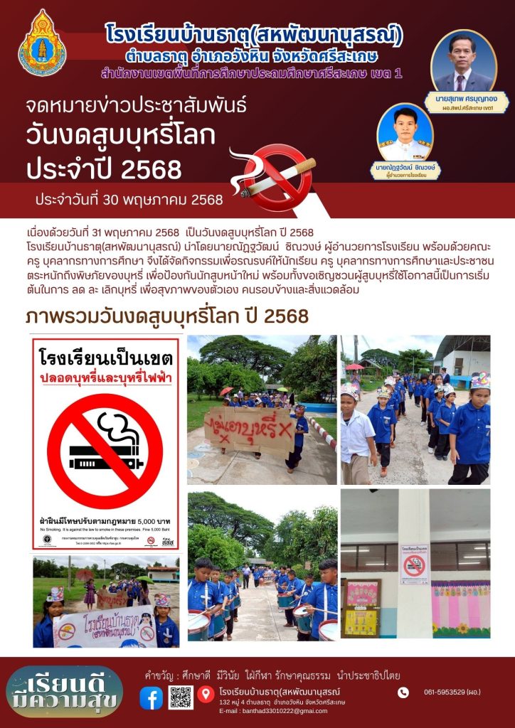 เนื่องด้วยวันที่ 31 พฤษภาคม พ.ศ. 2568 เป็นวันงดสูบบุหรี่โลก ปี 2568 โรงเรียนบ้านธาตุ(สหพัฒนานุสรณ์) นำโดยนายณัฏฐวัฒน์ ชิณวงษ์ ผู้อำนวยการโรงเรียน พร้อมด้วยคณะครู บุคลากรทางการศึกษา ได้จัดกิจกรรมเพื่อรณรงค์ให้นักเรียน ครู บุคลากรทางการศึกษา และประชาชนตระหนักถึงพิษภัยของบุหรี่ เพื่อสุขภาพของตัวเอง คนรอบข้างและสิ่งแวดล้อม