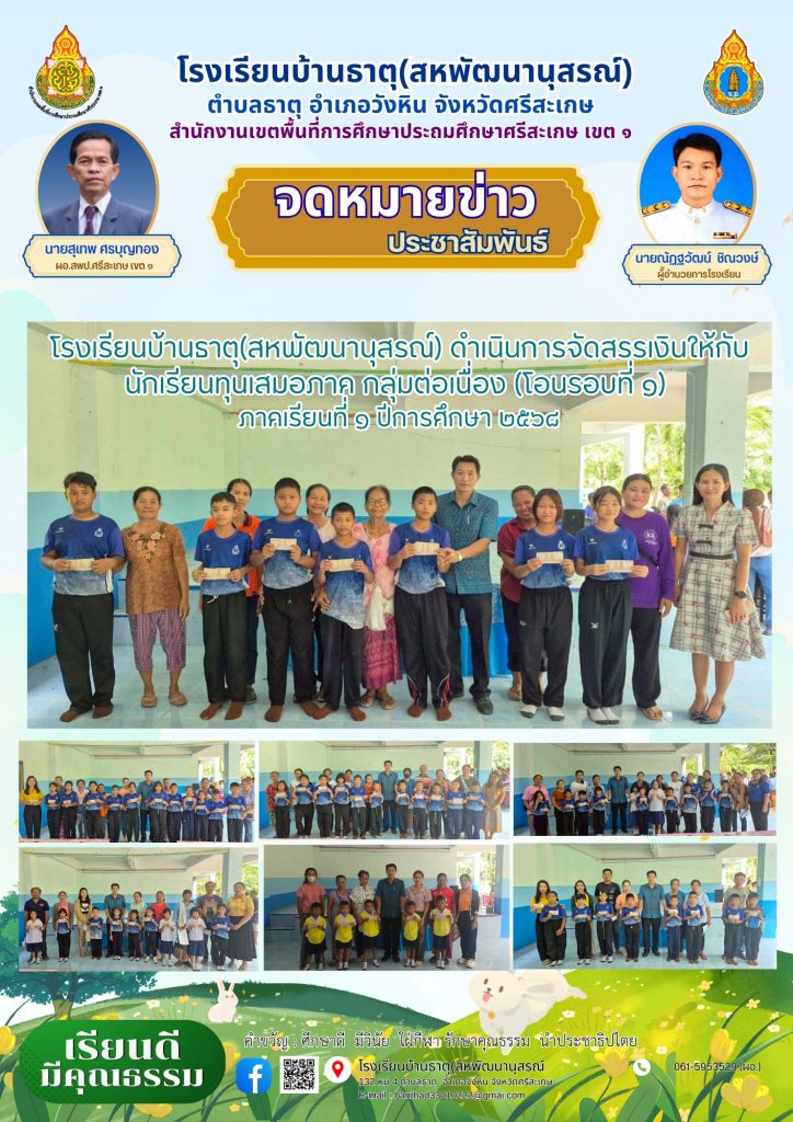 โรงเรียนบ้านธาตุ(สหพัฒนานุสรณ์) จัดสรรเงินให้กับนักเรียนทุนเสมอภาค กลุ่มต่อเนื่อง(โอนรอบที่1) ภาคเรียนที่ 1 ปีการศึกษา 2568