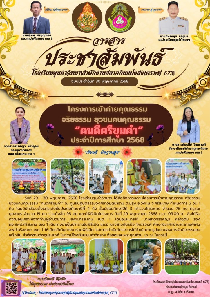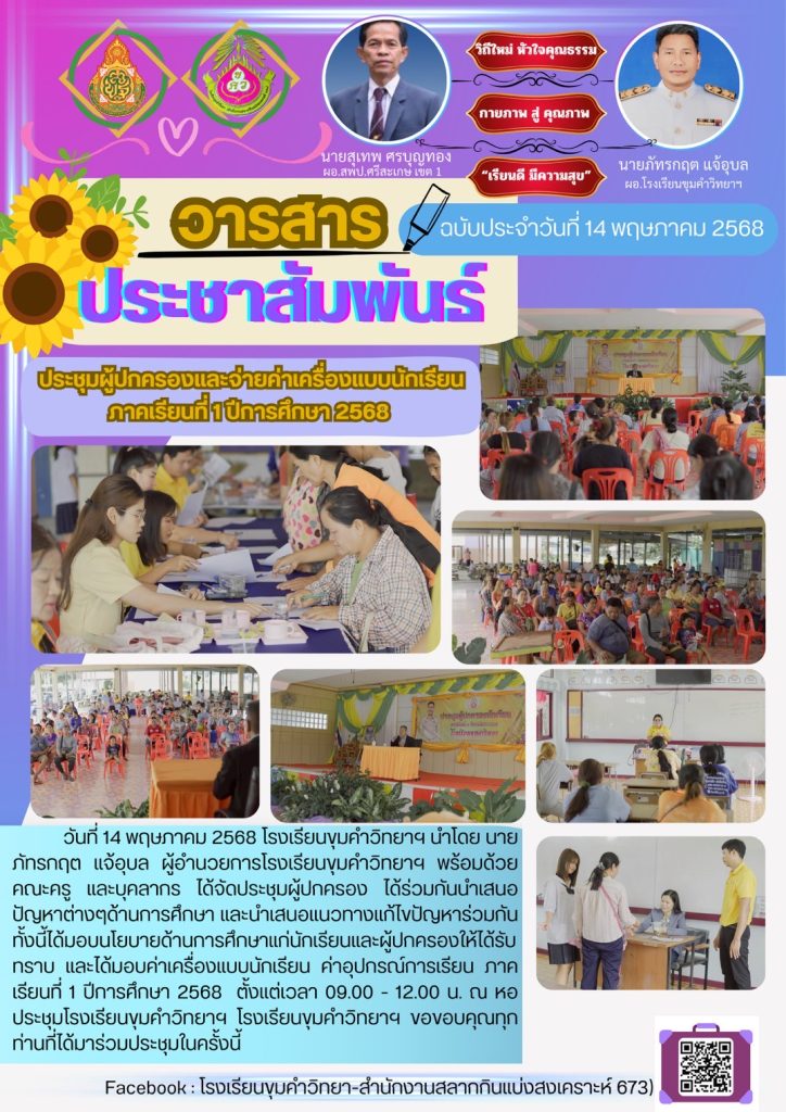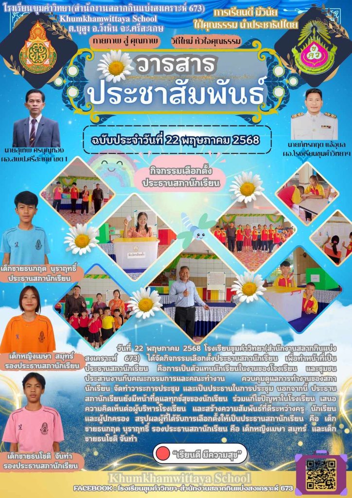 เมื่อวันที่ 22 พฤษาภาคม 2568 โรงเรียนขุมคำวิทยา ได้จัดให้มีการเลือกตั้งประธานสภานักเรียนเพื่อส่งเสริมประชาธิปไตยในสถานศึกษา