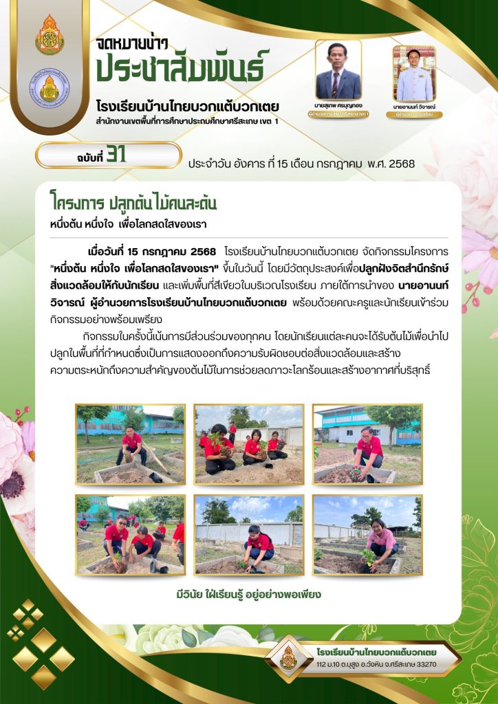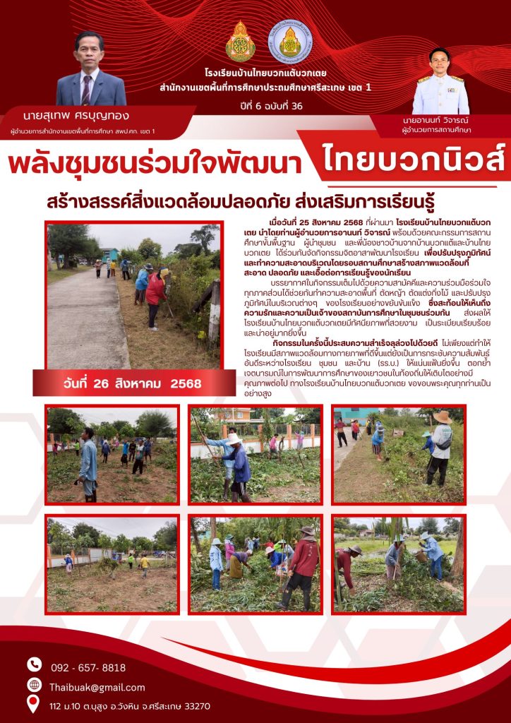 โรงเรียนบ้านไทยบวกแต้บวกเตย ร่วมกับผู้ปกครองนักเรียน ชุมชน ร่วมกันพัฒนา ตัดแต่งกิ่งไม้ หญ้าเพื่อความสวยงาม