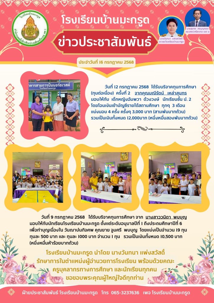 ประชาสัมพันธ์ เรื่องการมอบเงินบริจาค เพื่อการเป็นทุนการศึกษาให้กับนักเรียน