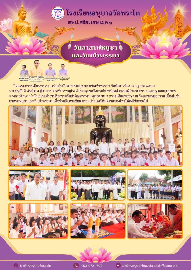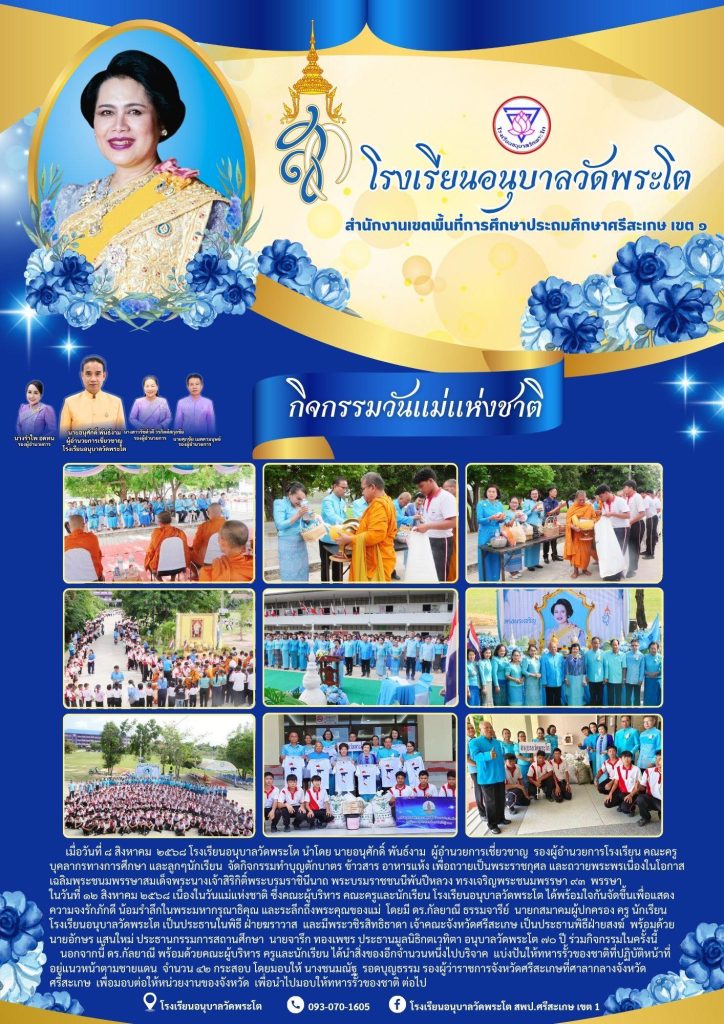 เมื่อวันที่ ๘ สิงหาคม ๒๕๖๘ โรงเรียนอนุบาลวัดพระโต นำโดย นายอนุศักดิิ์ พันธ์งาม ผู้อำนวยการเชี่ยวชาญ รองผู้อำนวยการโรงเรียน คณะครู บุคลากรทางการศึกษา และลูกๆนักเรียน จัดกิจกรรมทำบุญตักบาตร ข้าวสาร อาหารแห้ง เพื่อถวายเป็นพระราชกุศล และถวายพระพรเนื่องในโอกาสเฉลิมพระชนมพรรษา สมเด็จพระนางเจ้าสิริกิติ์ พระบรมราชินีนาถ พระบรมราชชนนีพันปีหลวง ทรงเจริญพระชนมพรรษา ๙๓ พรรษา ในวันที่ ๑๒ สิงหาคม ๒๕๖๘ เนื่องในวันแม่แห่งชาติ ซึ่งคณะผู้บริหาร คณะครูและนักเรียน โรงเรียนอนุบาลวัดพระโต ได้พร้อมใจกันจัดขึ้น เพื่อแสดงความจงรักภักดี น้อมรำลึกในพระมหากรุณาธิคุณ และระลึกถึงพระคุณของแม่ โดยมี ดร.กัลยาณี ธรรมจารีย์ นายกสมาคมผู้ปกครอง ครู นักเรียน โรงเรียนอนุบาลวัดพระโต เป็นประธานในพิธี ฝ่ายฆราวาส และมีพระวชิรสิทธิธาดา เจ้าคณะจังหวัดศรีสะเกษ เป็นประธานพิธีฝ่ายสงฆ์ พร้อมด้วยนายอักษร แสนใหม่ ประธานกรรมการสถานศึกษา นายจารึก ทองเพชร ประธานมูลนิธิกตเวทิตาอนุบาลวัดพระโต ๗๐ ปี ร่วมกิจกรรมในครั้งนี้