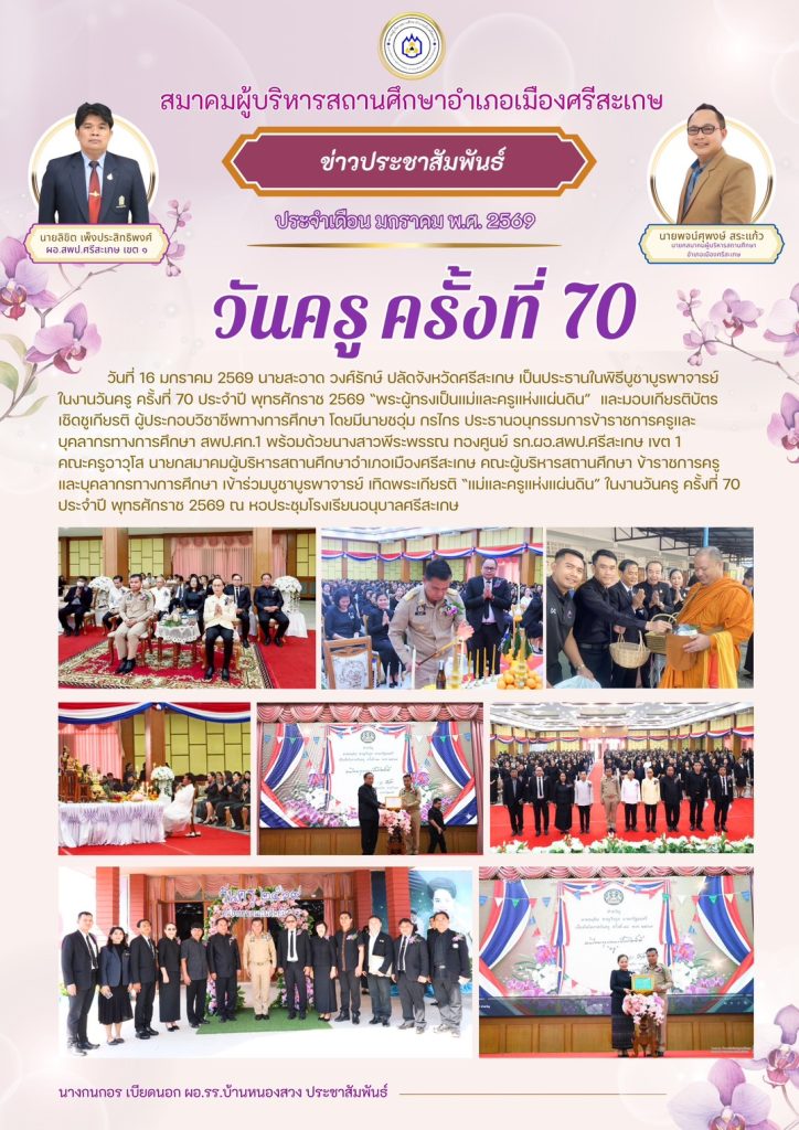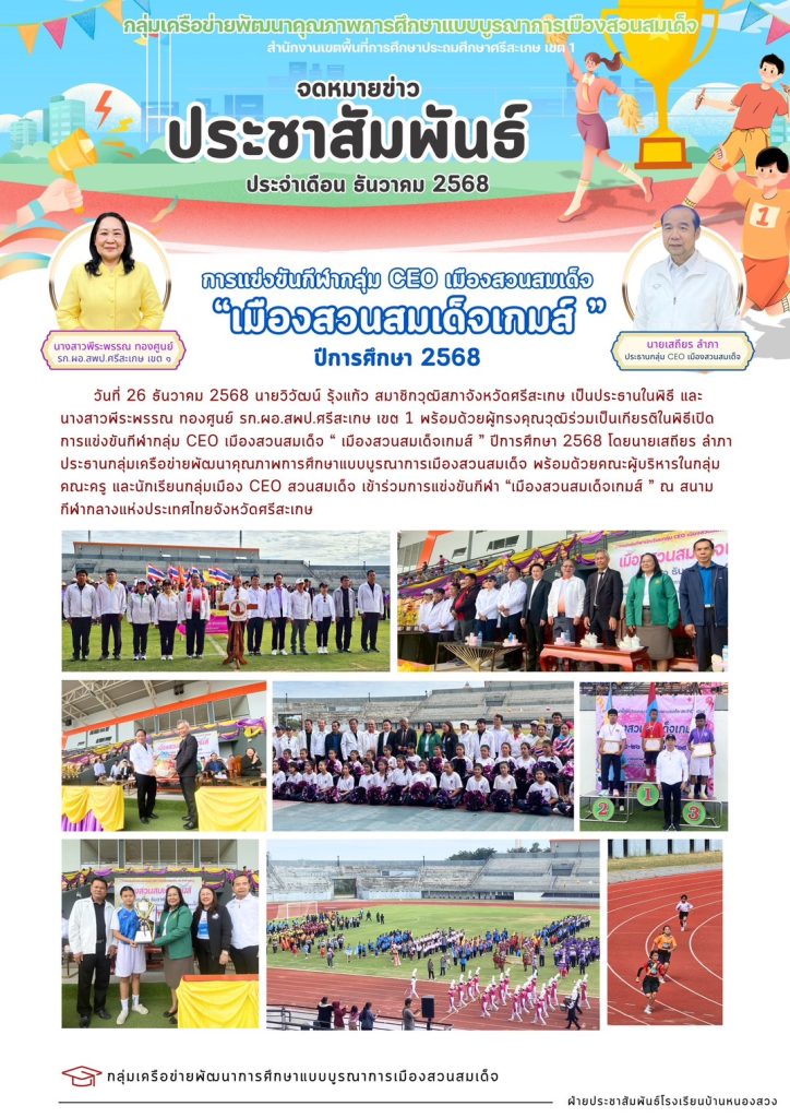 วันที่ 21 – 22 มิถุนายน พ.ศ. 2568 กลุ่มเครือข่ายพัฒนาคุณภาพการศึกษาแบบบูรณาการเมืองสวนสมเด็จ นำโดย นายเสถียร ลำภา ประธานกลุ่ม CEO เมืองสวนสมเด็จ พร้อมด้วยผู้อาวุโสและคณะผู้บริหารในกลุ่ม CEO เมืองสวนสมเด็จ ร่วมแสดงมุทิตาจิต นายพูลศักดิ์ ตุละวิภาค ผู้อำนวยการโรงเรียนราชประชานุเคราะห์ 29 จังหวัดศรีสะเกษ ในการนี้ได้รับเกียรติจาก ว่าที่ ร.ต.ดร.ทวีศักดิ์ นามศรี อดีต ผอ.สพป.ศรีสะเกษ เขต 1 เป็นประธานในพิธี พร้อมกันนี้ คณะผู้บริหารในกลุ่มได้ร่วมศึกษาดูงาน ณ โรงเรียนไทยรัฐวิทยา 87 (นิคมสร้างตนเอง 1) อำเภอสิรินธร จังหวัดอุบลราชธานี