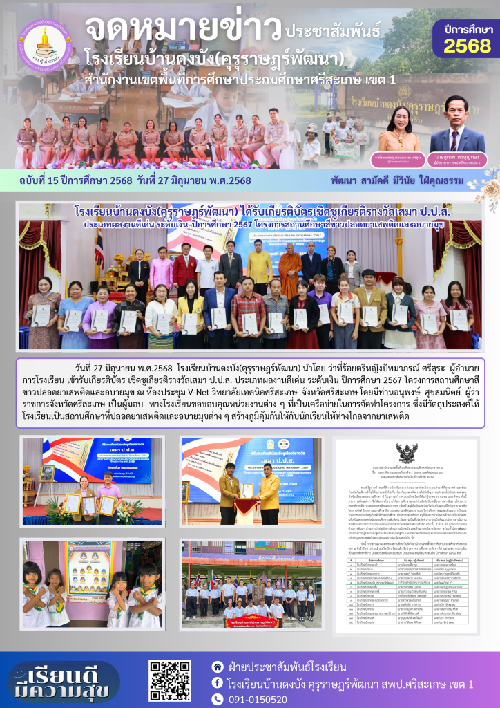 รับมอบเกียรติบัตรโรงเรียนที่ได้รับการรับรองมาตรฐานโรงเรียน อย.น้อย จากสำนักงานสาธารณสุข จังหวัดศรีสะเกษ