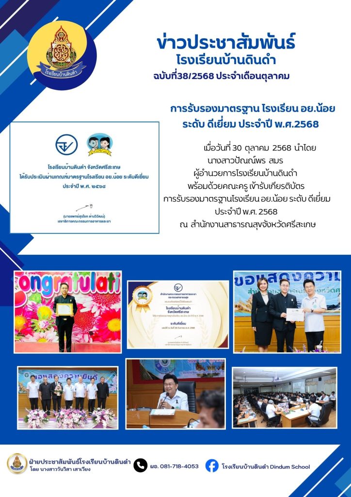 ขอแสดงความยินดี โรงเรียนบ้านดินดำ รับรางวัล โรงเรียนอีโคสคูล ระดับต้น (Eco-school Beginner)ปี2568-2571