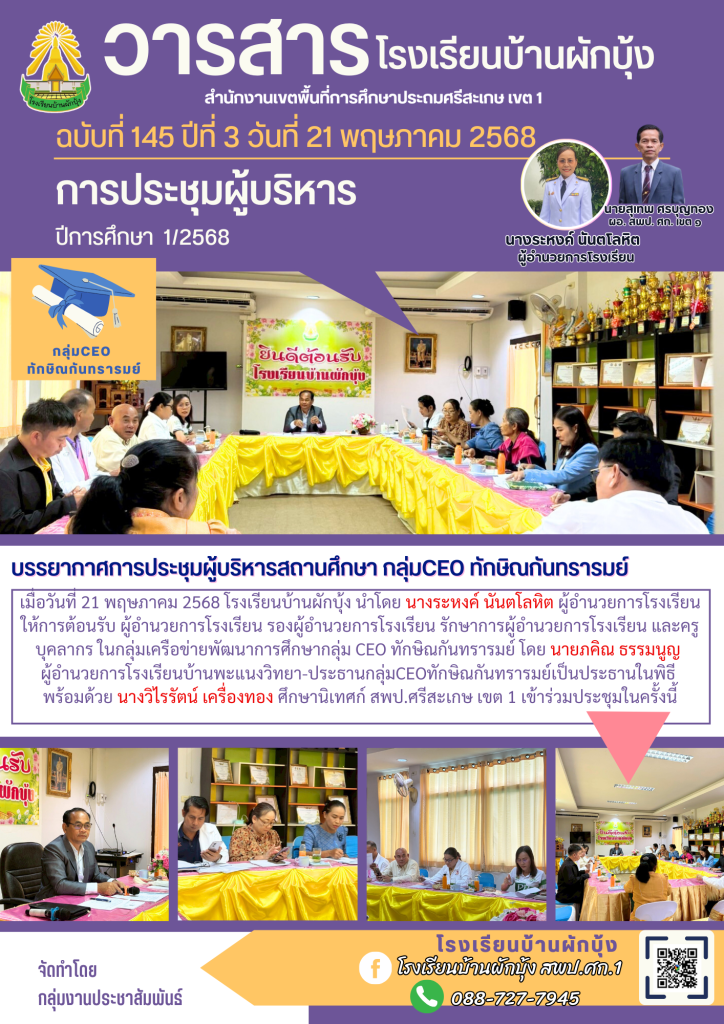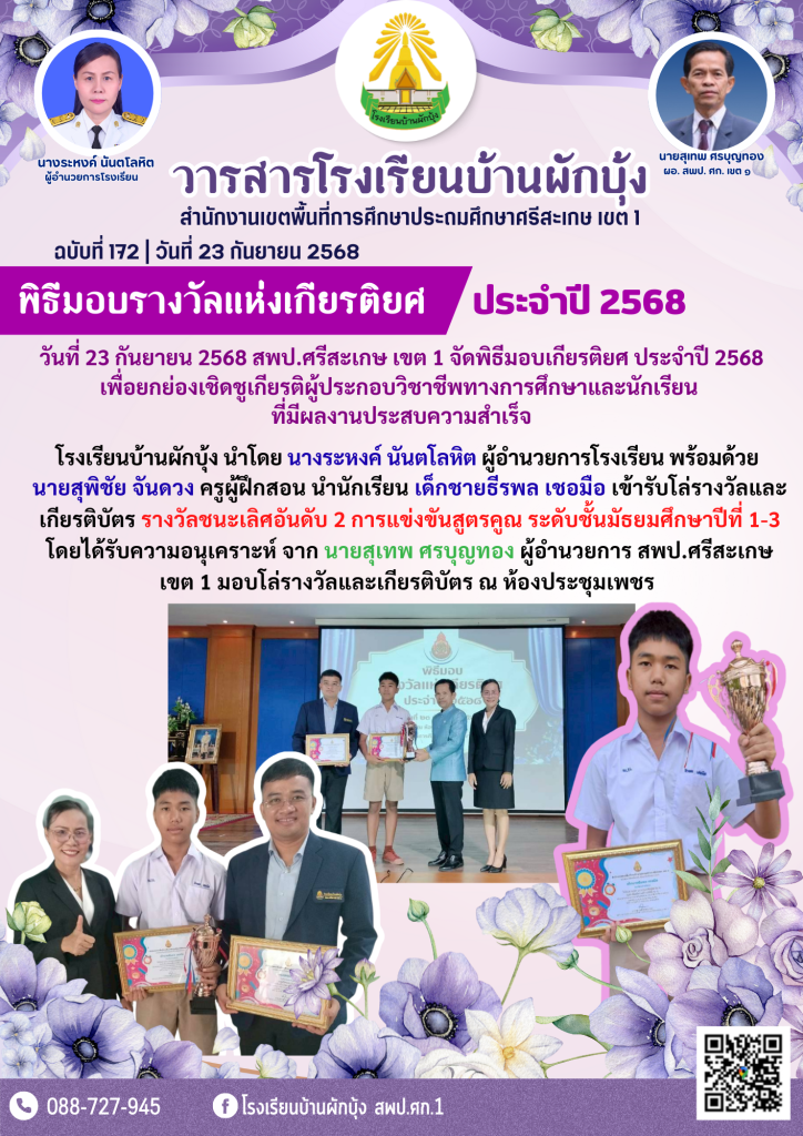 โรงเรียนบ้านผักบุ้ง รับโล่รางวัลและเกียรติบัตร ประจำปี 2568