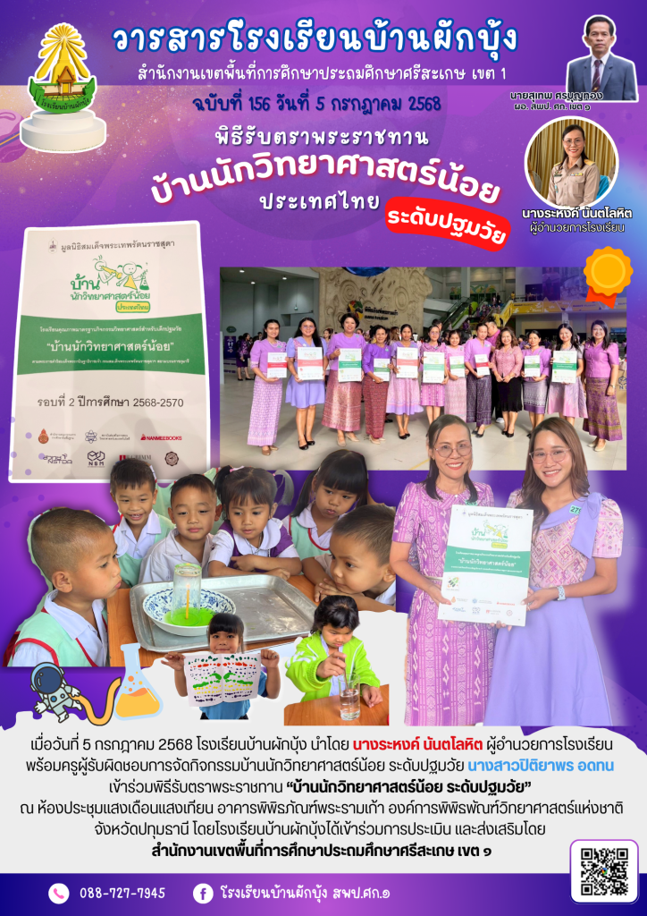 โรงเรียนบ้านผักบุ้ง เข้าพิธีรับตราพระราชทาน “บ้านนักวิทยาศาสตร์น้อยประเทศไทย” ระดับปฐมวัย