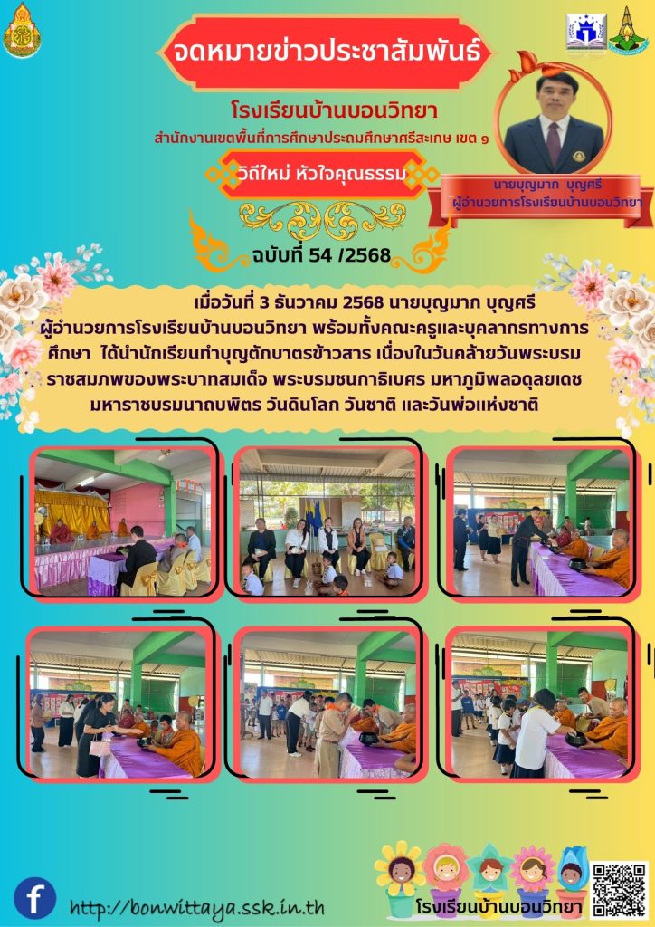 เมื่อวันที่ 3 ธันวาคม 2568 นายบุญมาก บุญศรี ผู้อำนวยการโรงเรียนบ้านบอนวิทยา พร้อมทั้งคณะครูและบุคลากรทางการศึกษา ได้นำนักเรียนทำบุญตักบาตรข้าวสาร เนื่องในวันคล้ายวันพระบรมราชสมภพของพระบาทสมเด็จ พระบรมชนกาธิเบศร มหาภูมิพลอดุลยเดชมหาราชบรมนาถบพิตร วันดินโลก วันชาติ และวันพ่อแห่งชาติ
