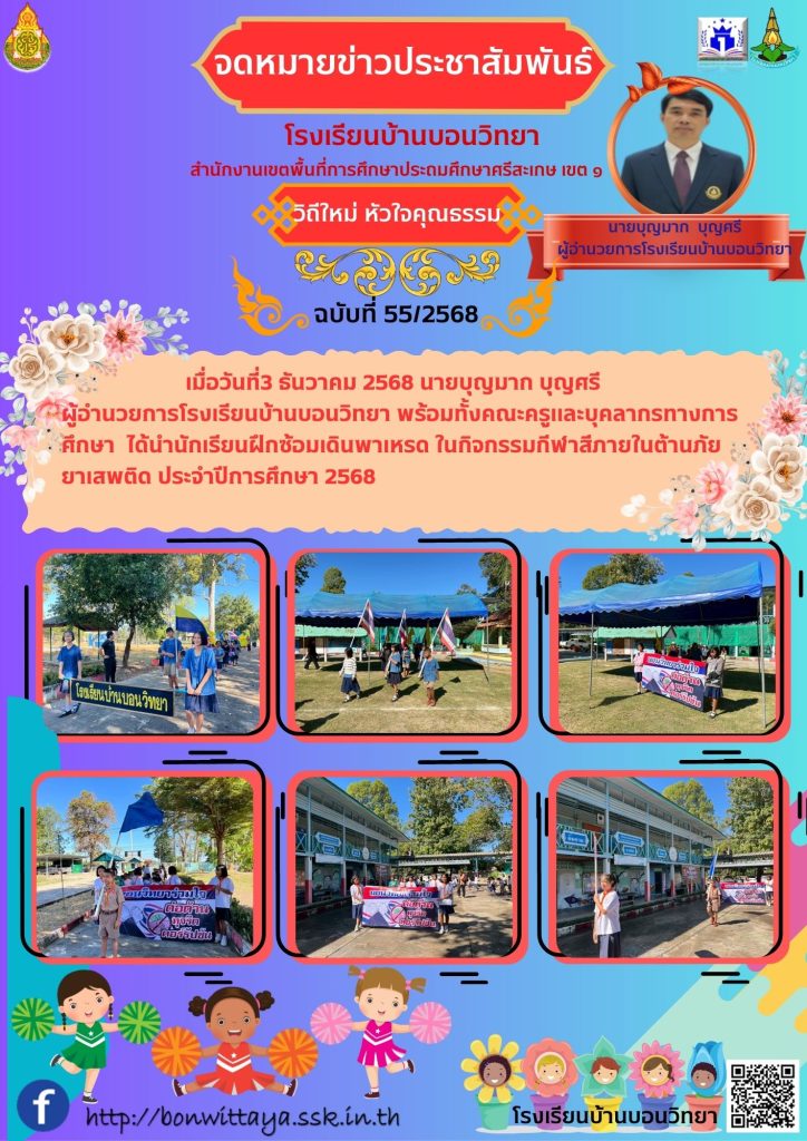 เมื่อวันที่3 ธันวาคม 2568 นายบุญมาก บุญศรี ผู้อำนวยการโรงเรียนบ้านบอนวิทยา พร้อมทั้งคณะครูและบุคลากรทางการศึกษา ได้นำนักเรียนฝึกซ้อมเดินพาเหรด ในกิจกรรมกีฬาสีภายในต้านภัย ยาเสพติด ประจำปีการศึกษา 2568