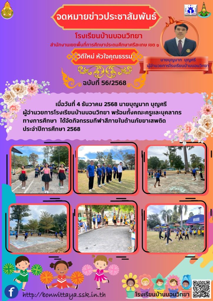 เมื่อวันที่ 4 ธันวาคม 2568 นายบุญมาก บุญศรี ผู้อำนวยการโรงเรียนบ้านบอนวิทยา พร้อมทั้งคณะครูและบุคลากรทางการศึกษา ได้จัดกิจกรรมกีฬาสีภายในต้านภัยยาเสพติด ประจำปีการศึกษา 2568 ณ สนามกีฬาโรงเรียนบ้านบอนวิทยา