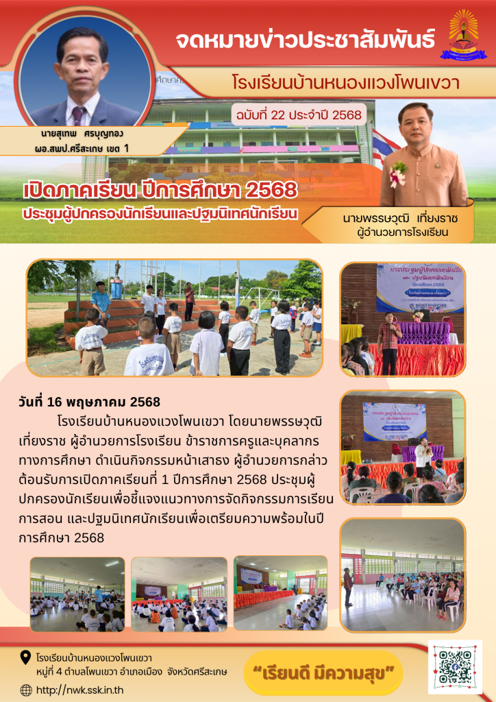 เปิดภาคเรียน ปีการศึกษา 2568 ประชุมผู้ปกครองนักเรียนและปฐมนิเทศนักเรียน