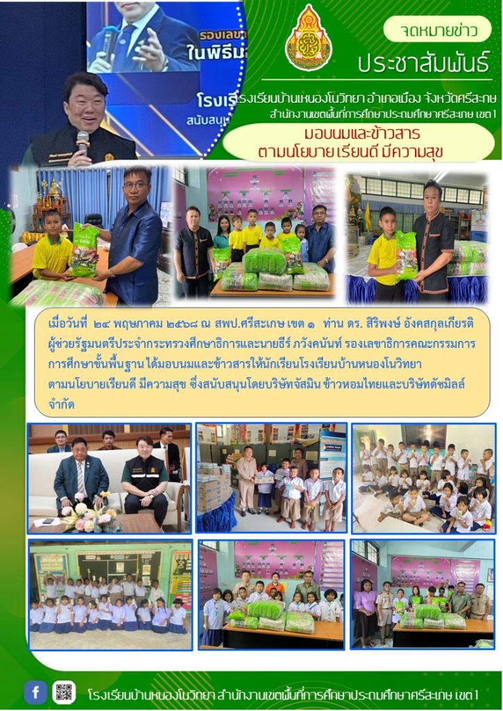 เมื่อวันที่ 24 พฤษภาคม 2568 ณ สพป.ศรีสะเกษ เขต 1 ท่าน ดร. สิริพงษ์ อังคสกุลเกียรติผู้ช่วยรัฐมนตรีประจำกระทรวงศึกษาธิการและนายธีร์ ภวังคนันท์ รองเลขาธิการคณะกรรมการการศึกษาขั้นพื้นฐาน ได้มอบนมและข้าวสารให้นักเรียนโรงเรียนบ้านหนองโนวิทยา ตามนโยบายเรียนดี มีความสุข ซึ่งสนับสนุนโดยบริษัทจัสมิน ข้าวหอมไทยและบริษัทดัชมิลล์ จำกัด