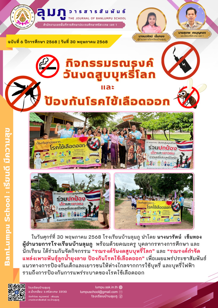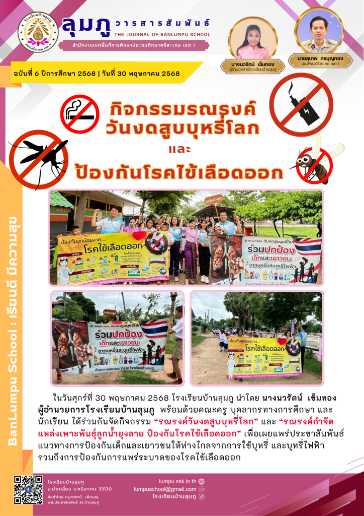 ในวันศุกร์ที่ 30 พฤษภาคม 2568 โรงเรียนบ้านลุมภู นำโดย นางนวรัตน์ เข็มทอง ผู้อำนวยการโรงเรียนบ้านลุมภู พร้อมด้วยคณะครู บุคลากรทางการศึกษา และนักเรียน ได้ร่วมกันจัดกิจกรรม “รณรงค์วันงดสูบบุหรี่โลก” และ “รณรงค์กำจัดแหล่งเพาะพันธ์ุลูกน้ำยุงลาย ป้องกันโรคไข้เลือดออก” เพื่อเผยแพร่ประชาสัมพันธ์ แนวทางการป้องกันเด็กและเยาวชนให้ห่างไกลจากการใช้บุหรี่ และบุหรี่ไฟฟ้ารวมถึงการป้องกันการแพร่ระบาดของโรคไข้เลือดออก
