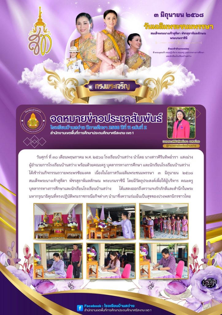 วันศุกร์ที่ ๓๐ เดือนพฤษภาคม พ.ศ. ๒๕๖๘ โรงเรียนบ้านสว่าง นำโดย นางสาวศิรินทิพย์วรา แสงม่วง ผู้อำนวยการโรงเรียนบ้านสว่าง พร้อมด้วยคณะครู บุคลากรทางการศึกษา และนักเรียนโรงเรียนบ้านสว่าง ได้เข้าร่วมกิจกรรมถวายพระพรชัยมงคล เนื่องในโอกาสวันเฉลิมพระชนมพรรษา ๓ มิถุนายน ๒๕๖๘ สมเด็จพระนางเจ้าสุทิดา พัชรสุธาพิมลลักษณ พระบรมราชินี โดยมีวัตถุประสงค์เพื่อให้ผู้บริหาร คณะครู บุคลากรทางการศึกษาและนักเรียนโรงเรียนบ้านสว่าง ได้แสดงออกถึงความจงรักภักดีและสำนึกในพระมหากรุณาธิคุณที่ทรงปฏิบัติพระราชกรณียกิจต่างๆ นำมาซึ่งความร่มเย็นเป็นสุขของปวงพสกนิกรชาวไทย