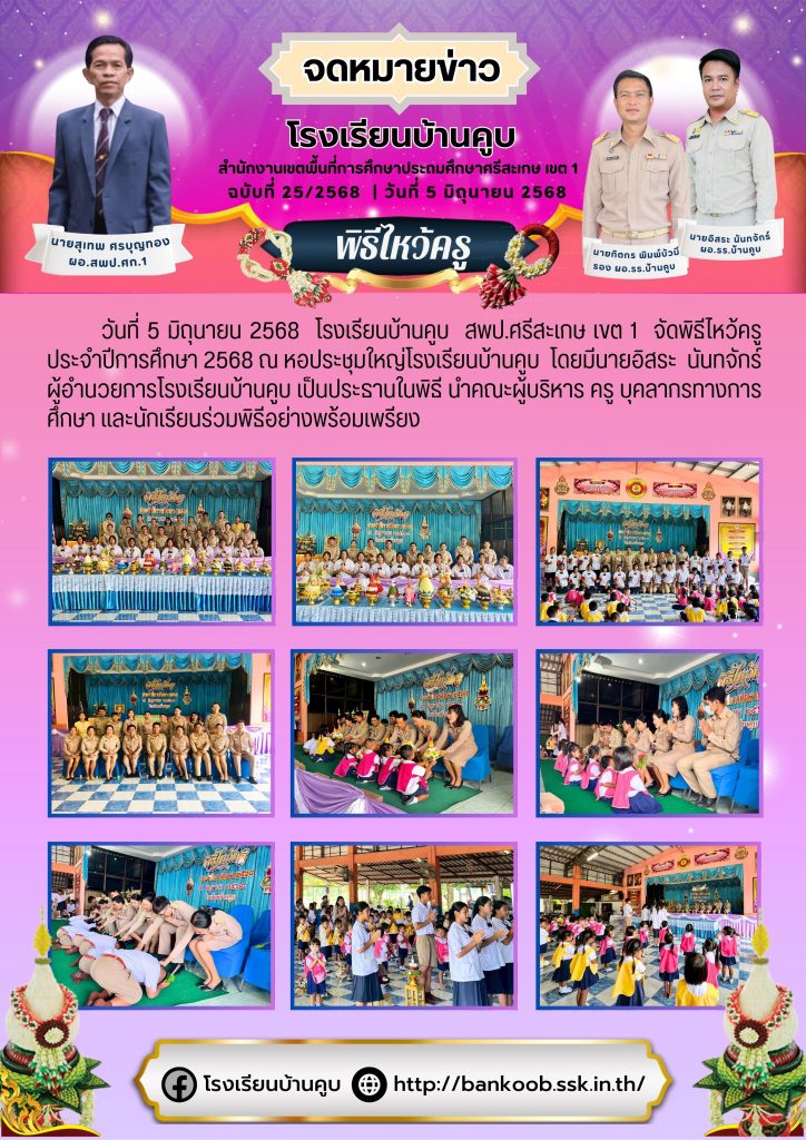 ในวันที่ 5 มิถุนายน พ.ศ. 2568 โรงเรียนบ้านคูบ ได้ดำเนินกิจกรรมพิธีไหว้ครู ประจำปีการศึกษา 2568 นำโดยนายอิสระ นันทจักร์ ผู้อำนวยการโรงเรียนบ้านคูบ นายกิตกร พิมพ์บัวมี รองผู้อำนวยการโรงเรียนบ้านคูบ ข้าราชการครูและบุคลากรทางการศึกษา และนักเรียน ร่วมพิธีดังกล่าวอย่างพร้อมเพรียงกัน