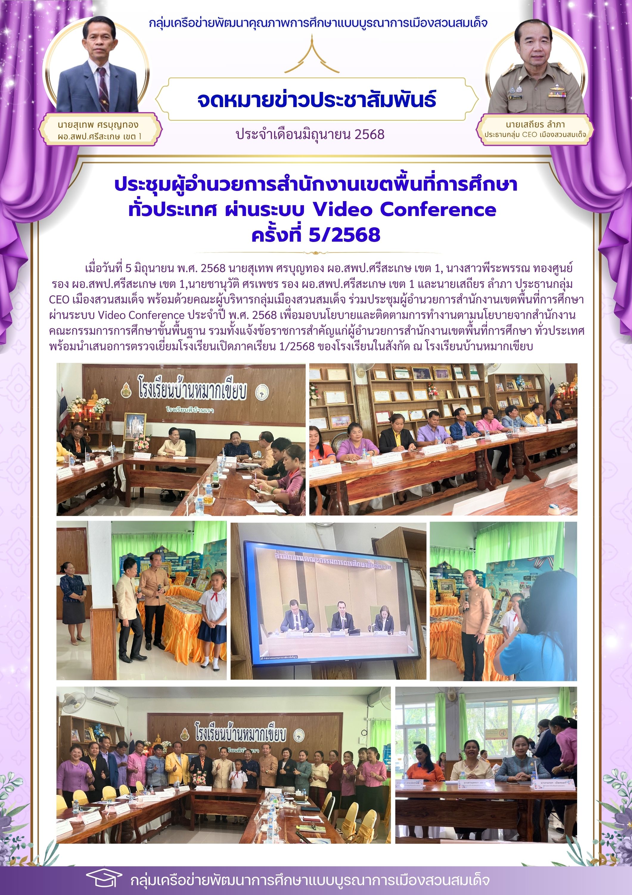 รอง ผอ.สพป.ศรีสะเกษ เขต 1,นายชานุวัติ ศรเพชร รอง ผอ.สพป.ศรีสะเกษ เขต 1 และนายเสถียร ลำภา ประธานกลุ่ม CEO เมืองสวนสมเด็จ พร้อมด้วยคณะผู้บริหารกลุ่มเมืองสวนสมเด็จ ร่วมประชุมผู้อำนวยการสำนักงานเขตพื้นที่การศึกษา ผ่านระบบ Video Conference ประจำปี พ.ศ. 2568 เพื่อมอบนโยบายและติดตามการทำงานตามนโยบายจากสำนักงานคณะกรรมการการศึกษาขั้นพื้นฐาน รวมทั้งแจ้งข้อราชการสำคัญแก่ผู้อำนวยการสำนักงานเขตพื้นที่การศึกษา ทั่วประเทศ พร้อมนำเสนอการตรวจเยี่ยมโรงเรียนเปิดภาคเรียน 1/2568 ของโรงเรียนในสังกัด ณ โรงเรียนบ้านหมากเขียบ