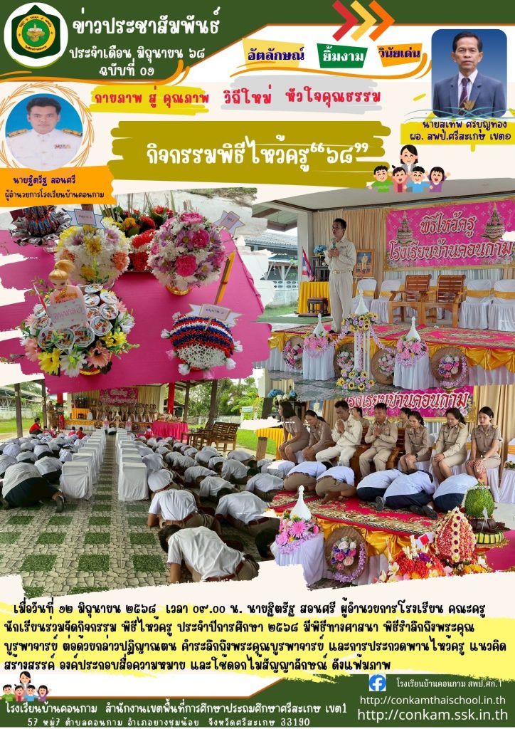 เมื่อวันที่ ๑๒ มิถุนายน ๒๕๖๘ เวลา ๐๙.๐๐ น. นายฐิตรัฐ สอนศรี ผู้อำนวยการโรงเรียน คณะครูนักเรียนร่วมจัดกิจกรรม พิธีไหว้ครู ประจำปีการศึกษา ๒๕๖๘ มีพิธีทางศาสนา พิธีรำลึกถึงพระคุณบูรพาจารย์ ต่อด้วยกล่าวปฏิญาณตน คำระลึกถึงพระคุณบูรพาจารย์ และการประกวดพานไหว้ครู แนวคิดสร้างสรรค์ องค์ประกอบสื่อความหมาย และใช้ดอกไม้สัญญาลักษณ์ ดังแฟ้มภาพ