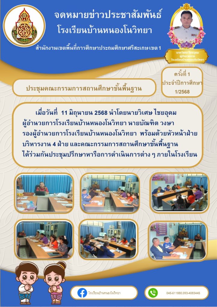 เมื่อวันที่ 11 มิถุนายน 2568 นำโดยนายวิเศษ ไชยอุดม ผู้อำนวยการโรงเรียนบ้านหนองโนวิทยา นายบัณฑิต วงษา รองผู้อำนวยการโรงเรียนบ้านหนองโนวิทยา พร้อมด้วยหัวหน้าฝ่ายบริหารงาน 4 ฝ่าย และคณะกรรมการสถานศึกษาขั้นพื้นฐาน ได้ร่วมกันประชุมปรึกษาหารือการดำเนินการต่างๆ ภายในโรงเรียน