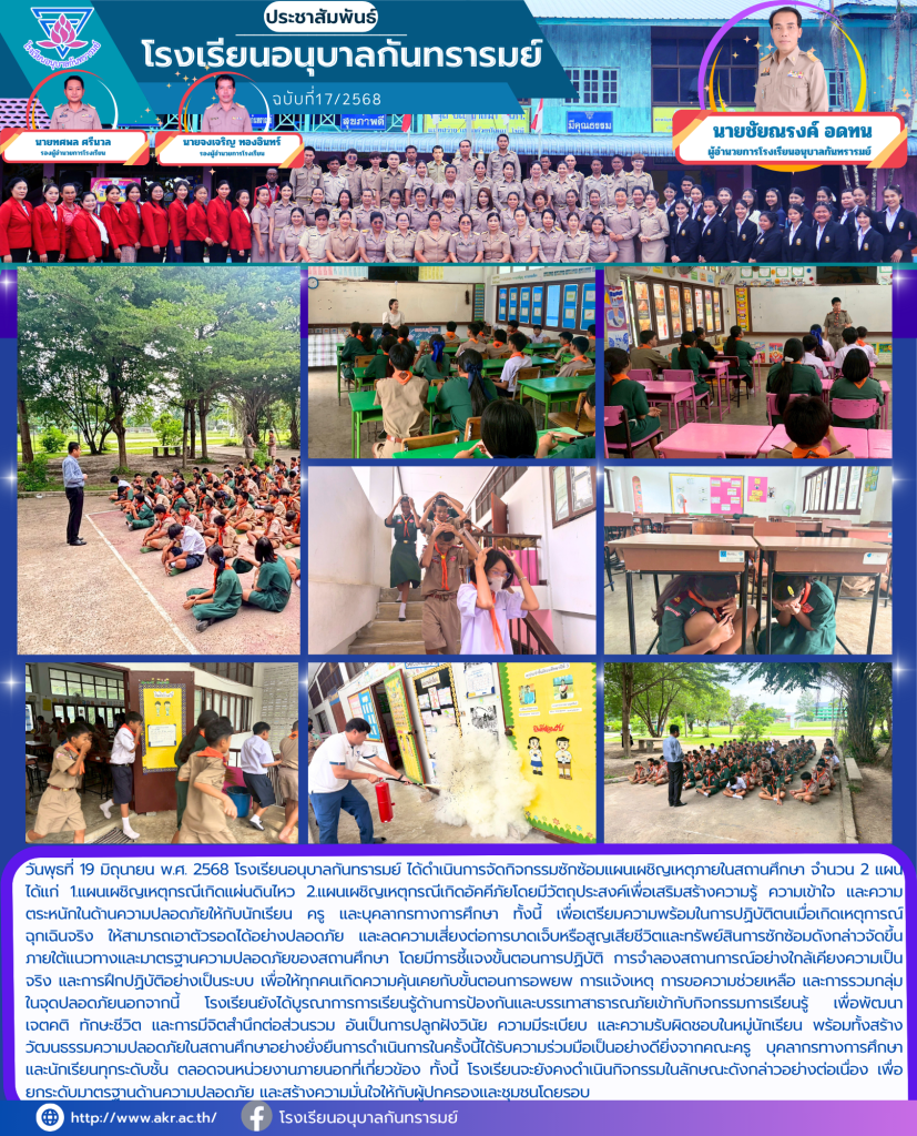 วันพุธที่ 19 มิถุนายน พ.ศ. 2568 โรงเรียนอนุบาลกันทรารมย์ ได้ดำเนินการจัดกิจกรรมซักซ้อมแผนเผชิญเหตุภายในสถานศึกษา จำนวน 2 แผน ได้แก่ 1.แผนเผชิญเหตุกรณีเกิดแผ่นดินไหว 2.แผนเผชิญเหตุกรณีเกิดอัคคีภัยโดยมีวัตถุประสงค์เพื่อเสริมสร้างความรู้ ความเข้าใจ และความตระหนักในด้านความปลอดภัยให้กับนักเรียน ครู และบุคลากรทางการศึกษา ทั้งนี้ เพื่อเตรียมความพร้อมในการปฏิบัติตนเมื่อเกิดเหตุการณ์ฉุกเฉินจริง ให้สามารถเอาตัวรอดได้อย่างปลอดภัย และลดความเสี่ยงต่อการบาดเจ็บหรือสูญเสียชีวิตและทรัพย์สินการซักซ้อมดังกล่าวจัดขึ้นภายใต้แนวทางและมาตรฐานความปลอดภัยของสถานศึกษา โดยมีการชี้แจงขั้นตอนการปฏิบัติ การจำลองสถานการณ์อย่างใกล้เคียงความเป็นจริง และการฝึกปฏิบัติอย่างเป็นระบบ เพื่อให้ทุกคนเกิดความคุ้นเคยกับขั้นตอนการอพยพ การแจ้งเหตุ การขอความช่วยเหลือ และการรวมกลุ่มในจุดปลอดภัยนอกจากนี้ โรงเรียนยังได้บูรณาการการเรียนรู้ด้านการป้องกันและบรรเทาสาธารณภัยเข้ากับกิจกรรมการเรียนรู้ เพื่อพัฒนาเจตคติ ทักษะชีวิต และการมีจิตสำนึกต่อส่วนรวม อันเป็นการปลูกฝังวินัย ความมีระเบียบ และความรับผิดชอบในหมู่นักเรียน พร้อมทั้งสร้างวัฒนธรรมความปลอดภัยในสถานศึกษาอย่างยั่งยืนการดำเนินการในครั้งนี้ได้รับความร่วมมือเป็นอย่างดียิ่งจากคณะครู บุคลากรทางการศึกษา และนักเรียนทุกระดับชั้น ตลอดจนหน่วยงานภายนอกที่เกี่ยวข้อง ทั้งนี้ โรงเรียนจะยังคงดำเนินกิจกรรมในลักษณะดังกล่าวอย่างต่อเนื่อง เพื่อยกระดับมาตรฐานด้านความปลอดภัย และสร้างความมั่นใจให้กับผู้ปกครองและชุมชนโดยรอบ