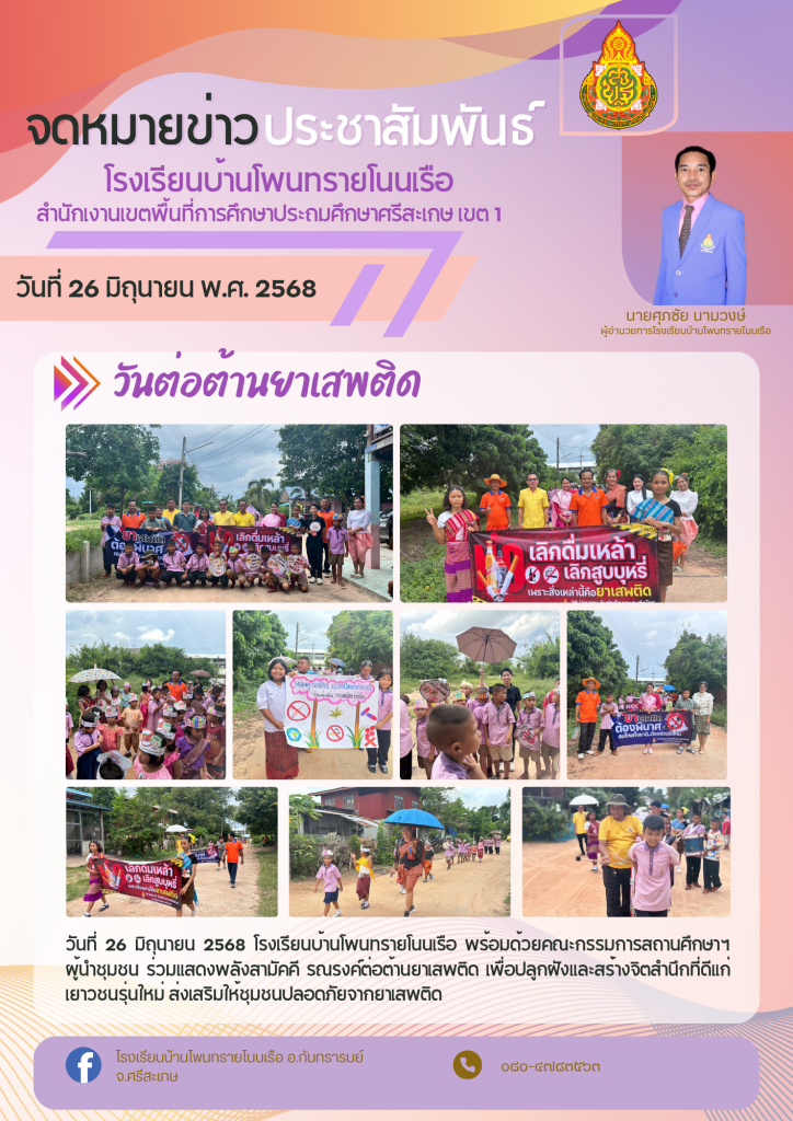 กิจกรรมเนื่องในวันต่อต้านยาเสพติดโลก ประจำปี ๒๕๖๘ ตามที่สมัชชาสหประชาชาติได้มีมติให้วันที่ ๒๖ มิถุนายนของทุกปี เป็นวันต่อต้านยาเสพติดโลก (International Day Against Drug Abuse and Illicit Trafficking) เพื่อร่วมกันรณรงค์และสร้างจิตสำนึกถึงภัยร้ายจากยาเสพติดซึ่งเป็นปัญหาระดับโลกนั้น โรงเรียนอนุบาลกันทรารมย์
