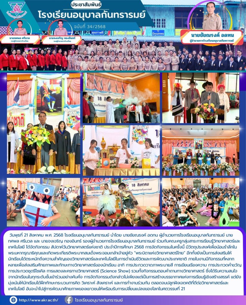 วันพุธที่ 21 สิงหาคม พ.ศ. 2568 โรงเรียนอนุบาลกันทรารมย์ นำโดย นายชัยณรงค์ อดทน ผู้อำนวยการโรงเรียนอนุบาลกันทรารมย์ นายทศพล ศรีนวล และ นายจงเจริญ ทองอินทร์ รองผู้อำนวยการโรงเรียนอนุบาลกันทรารมย์ ร่วมกับคณะครูกลุ่มสาระการเรียนรู้วิทยาศาสตร์และเทคโนโลยี ได้จัดกิจกรรม สัปดาห์วันวิทยาศาสตร์แห่งชาติ ประจำปีการศึกษา 2568 การจัดกิจกรรมในครั้งนี้ มีวัตถุประสงค์เพื่อน้อมรำลึกในพระมหากรุณาธิคุณและเทิดพระเกียรติพระบาทสมเด็จพระจอมเกล้าเจ้าอยู่หัว “พระบิดาแห่งวิทยาศาสตร์ไทย” อีกทั้งยังเป็นการส่งเสริมให้นักเรียนได้ตระหนักถึงความสำคัญของวิทยาศาสตร์และเทคโนโลยีในการดำเนินชีวิตและการพัฒนาประเทศชาติ ภายในงานมีกิจกรรมที่หลากหลายเพื่อส่งเสริมศักยภาพและทักษะทางวิทยาศาสตร์ของนักเรียน อาทิ การประกวดวาดภาพระบายสี การเขียนเรียงความ การประกวดคำขวัญ การประกวดชุดรีไซเคิล การแสดงละครทางวิทยาศาสตร์ (Science Show) รวมทั้งกิจกรรมตอบคำถามทางวิทยาศาสตร์ ซึ่งได้รับความสนใจจากนักเรียนในทุกระดับชั้นเข้าร่วมอย่างคับคั่ง การจัดกิจกรรมดังกล่าวไม่เพียงแต่เป็นการสร้างบรรยากาศแห่งการเรียนรู้เชิงสร้างสรรค์ แต่ยังมุ่งเน้นให้นักเรียนได้ฝึกทักษะกระบวนการคิด วิเคราะห์ สังเคราะห์ และการทำงานร่วมกัน ตลอดจนปลูกฝังเจตคติที่ดีต่อวิทยาศาสตร์และเทคโนโลยี อันจะนำไปสู่การพัฒนาศักยภาพของเยาวชนให้พร้อมรับการเปลี่ยนแปลงของโลกในศตวรรษที่ 21