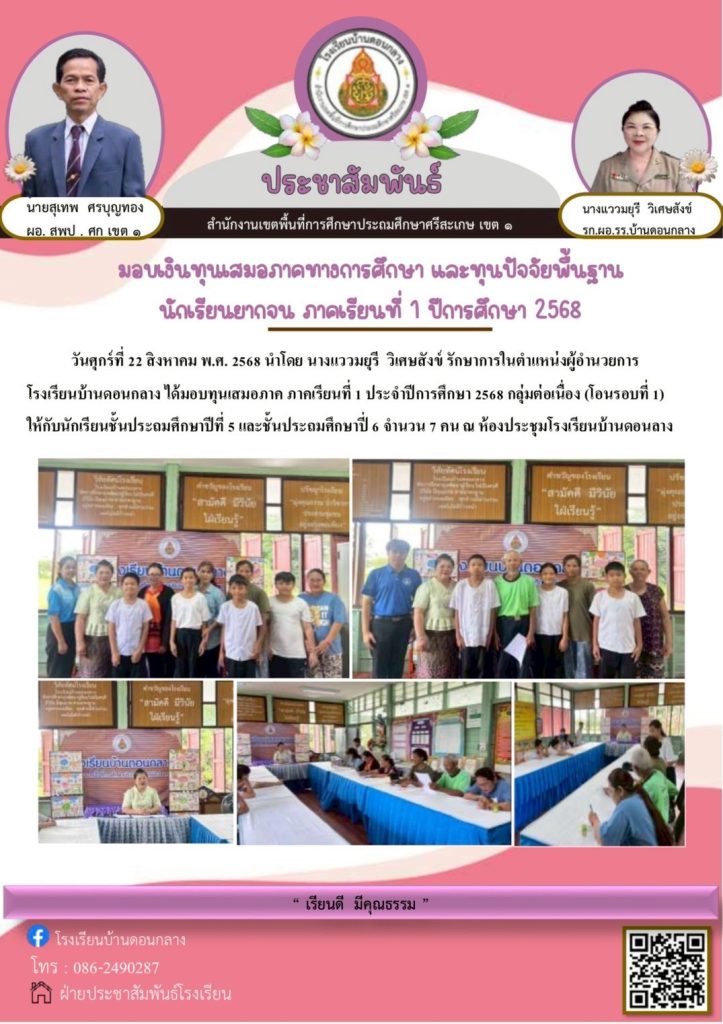 มอบเงินทุนเสมอภาคทางการศึกษา และทุนปัจจัยพื้นฐานนักเรียนยากจน ภาคเรียนที่ 1 ปีการศึกษา 2568
