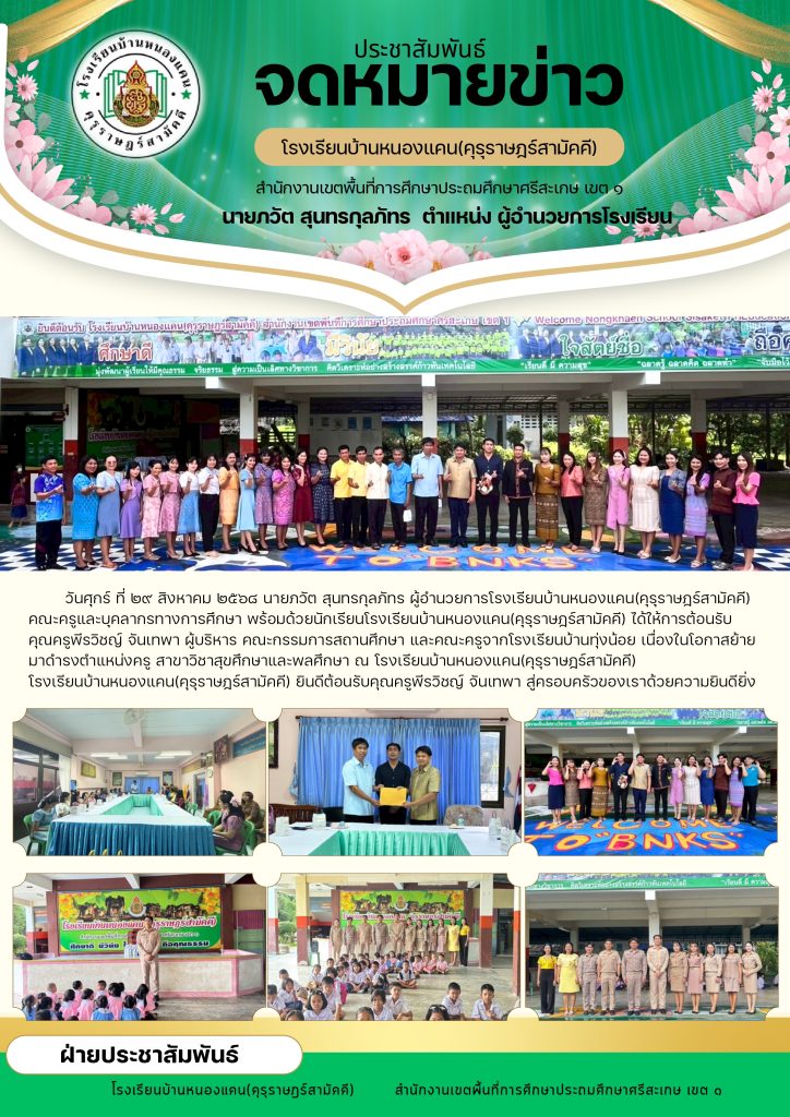 ผู้บริหาร คณะครูและบุคลากรทางการศึกษา พร้อมด้วยนักเรียน ให้การต้อนรับคุณครูพีรวิชญ์ จันเทพา เนื่องในโอกาสย้ายมาดำรงตำแหน่งครู ณ โรงเรียนบ้านหนองแคน(คุรุราษฎร์สามัคคี) เมื่อวันศุกร์ ที่่ 29 สิงหาคม 2568