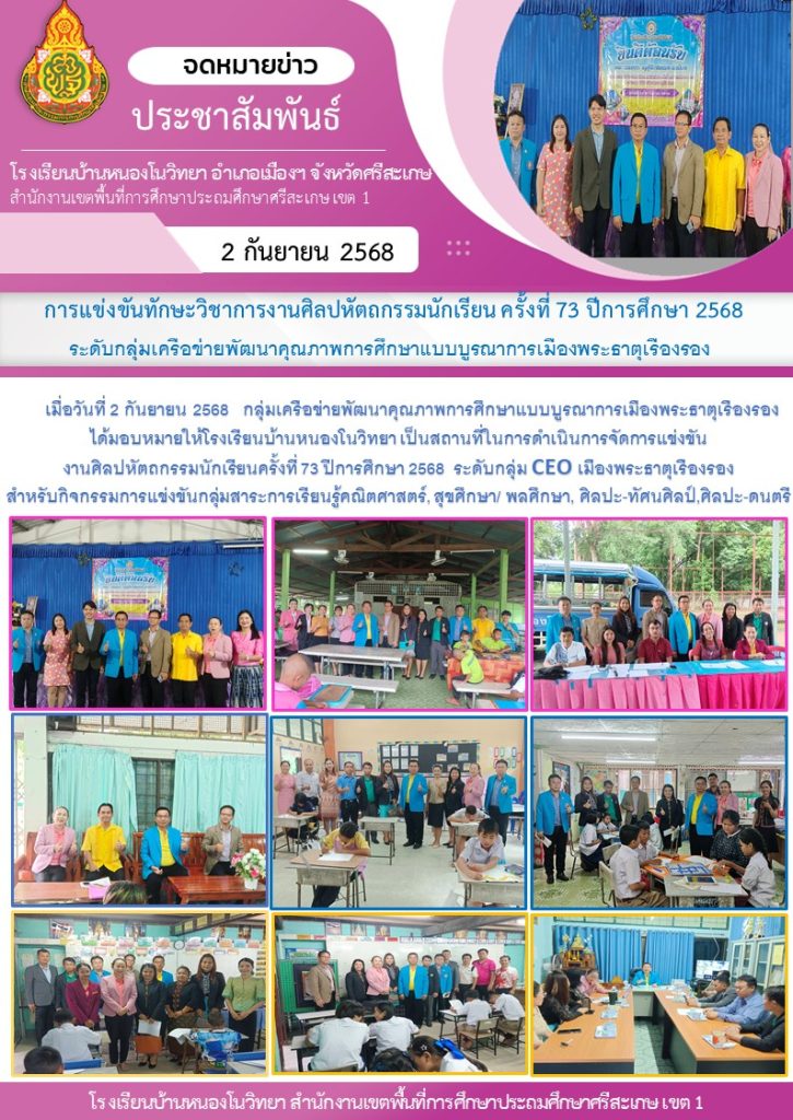 งานศิลปหัตถกรรมนักเรียนครั้งที่ 73 ปีการศึกษา 2568 ระดับกลุ่ม CEO เมืองพระธาตุเรืองรองสำหรับกิจกรรมการแข่งขันกลุ่มสาระการเรียนรู้คณิตศาสตร์, สุขศึกษา/ พลศึกษา, ศิลปะ-ทัศนศิลป์,ศิลปะ-ดนตรี