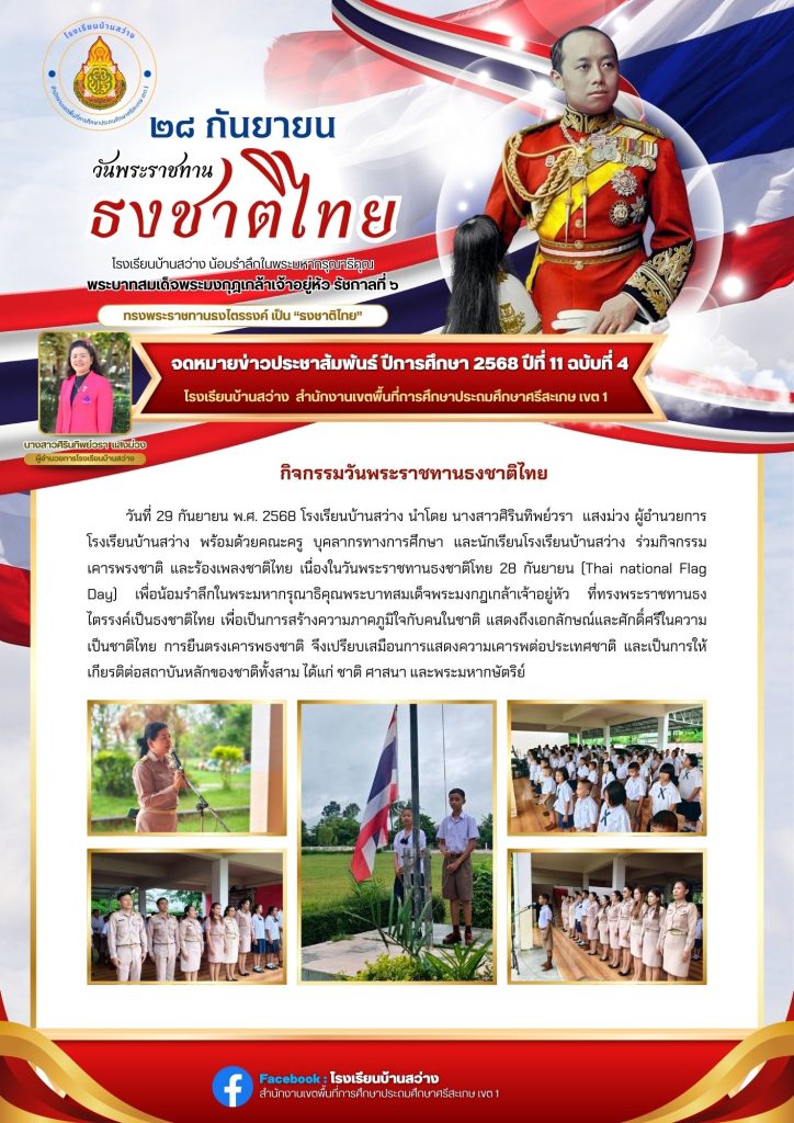 วันที่ 29 กันยายน พ.ศ. 2568 โรงเรียนบ้านสว่าง นำโดย นางสาวศิรินทิพย์วรา แสงม่วง ผู้อำนวยการโรงเรียนบ้านสว่าง พร้อมด้วยคณะครู บุคลากรทางการศึกษา และนักเรียนโรงเรียนบ้านสว่าง ร่วมกิจกรรมเคารพรงชาติ และร้องเพลงชาติไทย เนื่องในวันพระราชทานธงชาติโทย 28 กันยายน (Thai national Flag Day) เพื่อน้อมรำลึกในพระมหากรุณาธิคุณพระบาทสมเด็จพระมงกฎเกล้าเจ้าอยู่หัว ที่ทรงพระราชทานธงไตรรงค์เป็นธงชาติไทย เพื่อเป็นการสร้างความภาคภูมิใจกับคนในชาติ แสดงถึงเอกลักษณ์และศักดิ์ศรีในความเป็นชาติไทย การยืนตรงเคารพธงชาติ จึงเปรียบเสมือนการแสดงความเคารพต่อประเทศชาติ และเป็นการให้เกียรติต่อสถาบันหลักของชาติทั้งสาม ได้แก่ ชาติ ศาสนา และพระมหากษัตริย์