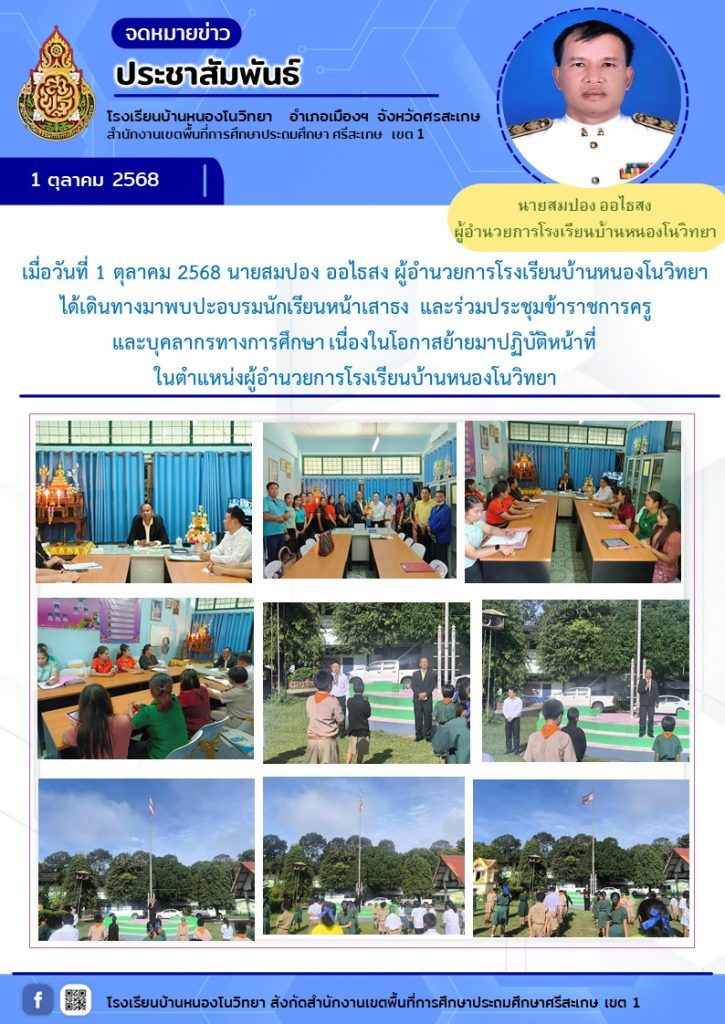เมื่อวันที่ 1 ตุลาคม 2568 นายสมปอง ออไธสง ผู้อำนวยการโรงเรียนบ้านหนองโนวิทยา