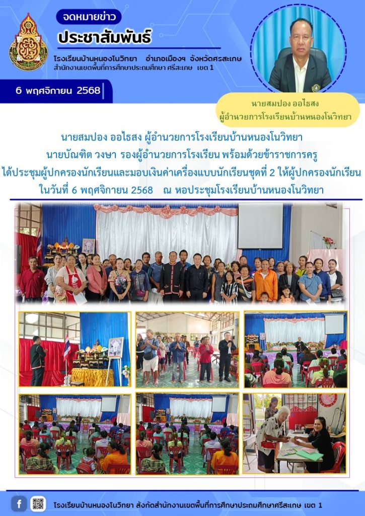 ได้ประชุมผู้ปกครองนักเรียนและมอบเงินค่าเครื่องแบบนักเรียนชุดที่ 2 ให้ผู้ปกครองนักเรียนในวันที่ 6 พฤศจิกายน 2568 ณ หอประชุมโรงเรียนบ้านหนองโนวิทยา