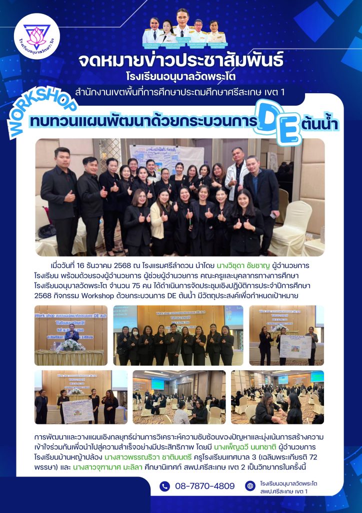 เมื่อวันที่ 16 ธันวาคม 2568 ณ โรงแรมศรีลำดวน นำโดย นางวิชุดา ชัยชาญ ผู้อำนวยการโรงเรียน พร้อมด้วยรองผู้อำนวยการ ผู้ช่วยผู้อำนวยการ คณะครูและบุคลากรทางการศึกษา โรงเรียนอนุบาลวัดพระโต จำนวน 75 คน ได้ดำเนินการจัดประชุมเชิงปฏิบัติการประจำปีการศึกษา 2568 กิจกรรม Workshop ทบทวนแผนพัฒนาด้วยกระบวนการ DE ต้นน้ำ มีวัตถุประสงค์เพื่อกำหนดเป้าหมายการพัฒนาและวางแผนเชิงกลยุทธ์ผ่านการวิเคราะห์ความซับซ้อนของปัญหาและมุ่งเน้นการสร้างความเข้าใจร่วมกันเพื่อนำไปสู่ความสำเร็จอย่างมีประสิทธิภาพ โดยมี นางเพ็ญฉวี นนทชาติ ผู้อำนวยการโรงเรียนบ้านหญ้าปล้อง นางสาวพรรณธิวา ชาติมนตรี ครูโรงเรียนเทศบาล 3 (เฉลิมพระเกียรติ 72 พรรษา) และ นางสาวจุฑามาศ มะลิลา ศึกษานิเทศก์ สพป.ศรีสะเกษ เขต 2 เป็นวิทยากรในครั้งนี้