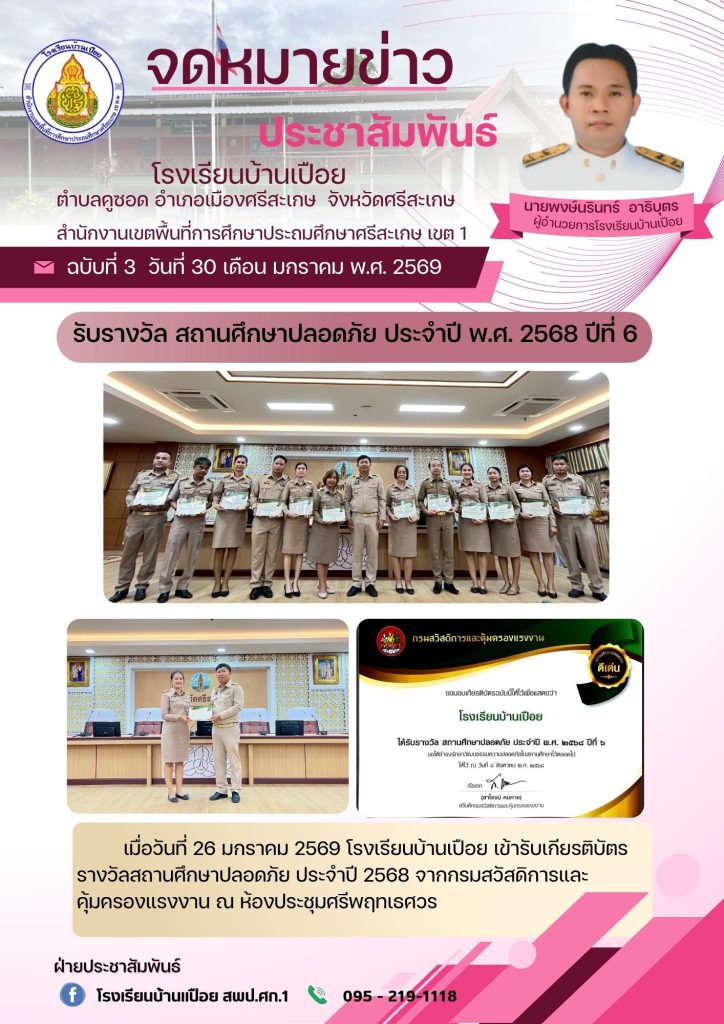 รับรางวัล สถานศึกษาปลอดภัย ประจำปี พ.ศ. 2568 ปีที่ 6