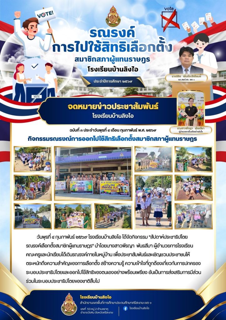 วันพุธที่ ๔ กุมภาพันธ์ ๒๕๖๙ โรงเรียนบ้านลิงไอ ได้จัดกิจกรรม “สัปดาห์ประชาธิปไตย รณรงค์เลือกตั้งสมาชิกผู้แทนราษฎร” นำโดยนางสาวพีรญา พันธสีมา ผู้อำนวยการโรงเรียน คณะครูและนักเรียนได้เดินรณรงค์ภายในหมู่บ้าน เพื่อประชาสัมพันธ์และเชิญชวนประชาชนให้ตระหนักถึงความสำคัญของการเลือกตั้ง สร้างความรู้ ความเข้าใจที่ถูกต้องเกี่ยวกับการปกครองระบอบประชาธิปไตยและออกไปใช้สิทธิของตนเองอย่างพร้อมเพรียง อันเป็นการส่งเสริมการมีส่วนร่วมในระบอบประชาธิปไตยของชาติสืบไป