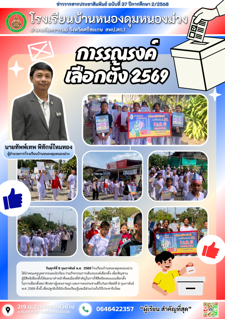 วันศุกร์ที่ 6 กุมภาพันธ์ 2569 โรงเรียนบ้านหนองดุมหนองม่วง ร่วมเดินรณรงค์การออกมาใช้สิทธิเลือกตั้งสมาชิกสภาผู้แทนราษฎร (ส.ส.) เพื่อเชิญชวนผู้มีสิทธิเลือกตั้งทุกท่าน ออกไปทำหน้าที่พลเมืองที่สำคัญ ได้แก่ การเลือกตั้งสมาชิกสภาผู้แทนราษฎร และการออกเสียงลงประชามติ ในการเลือกตั้งระดับชาติ วันที่ 8 กุมภาพันธ์ พ.ศ. 2569
