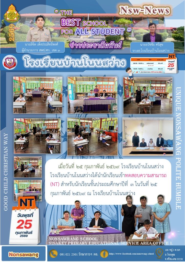 เมื่อวันที่ 25 กุมภาพันธ์ 2569 โรงเรียนบ้านโนนสว่างเข้าทดสอบความสามารถ (NT)