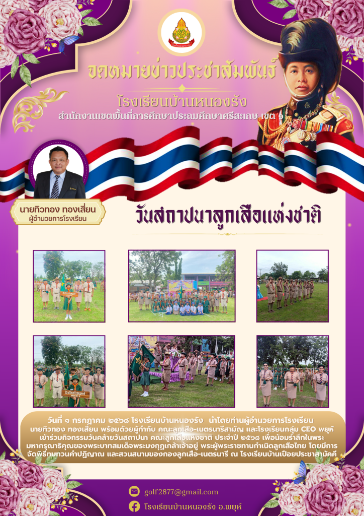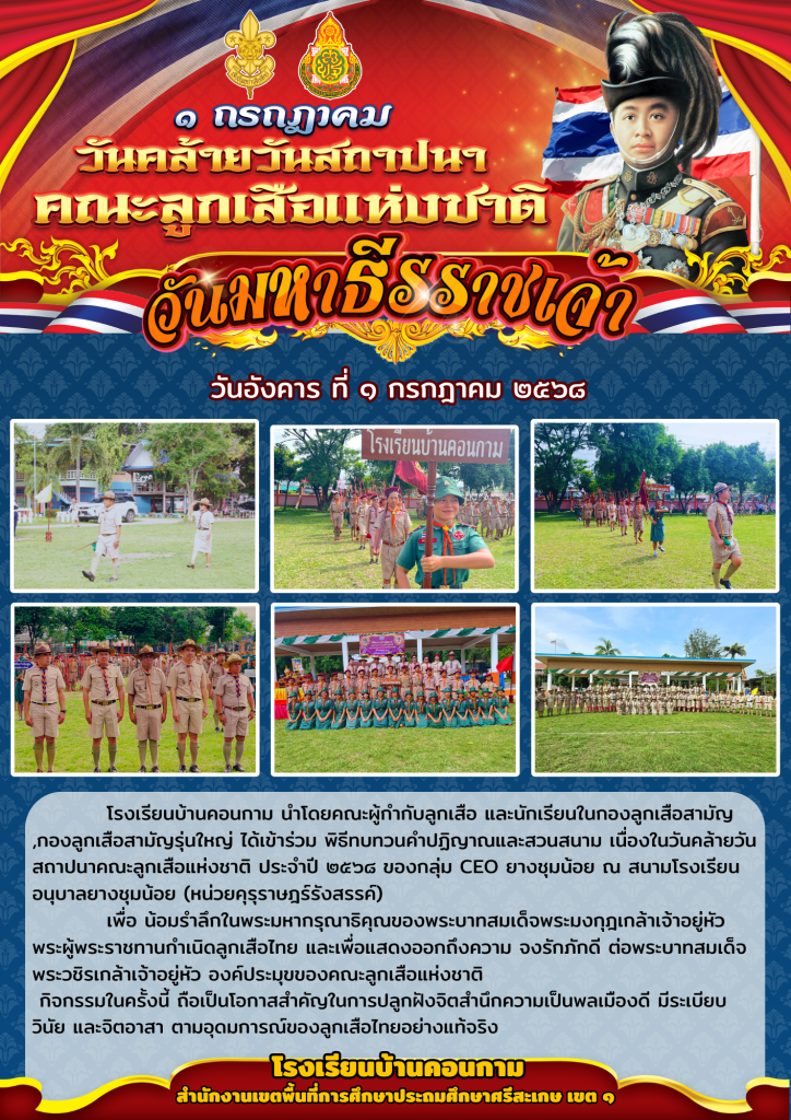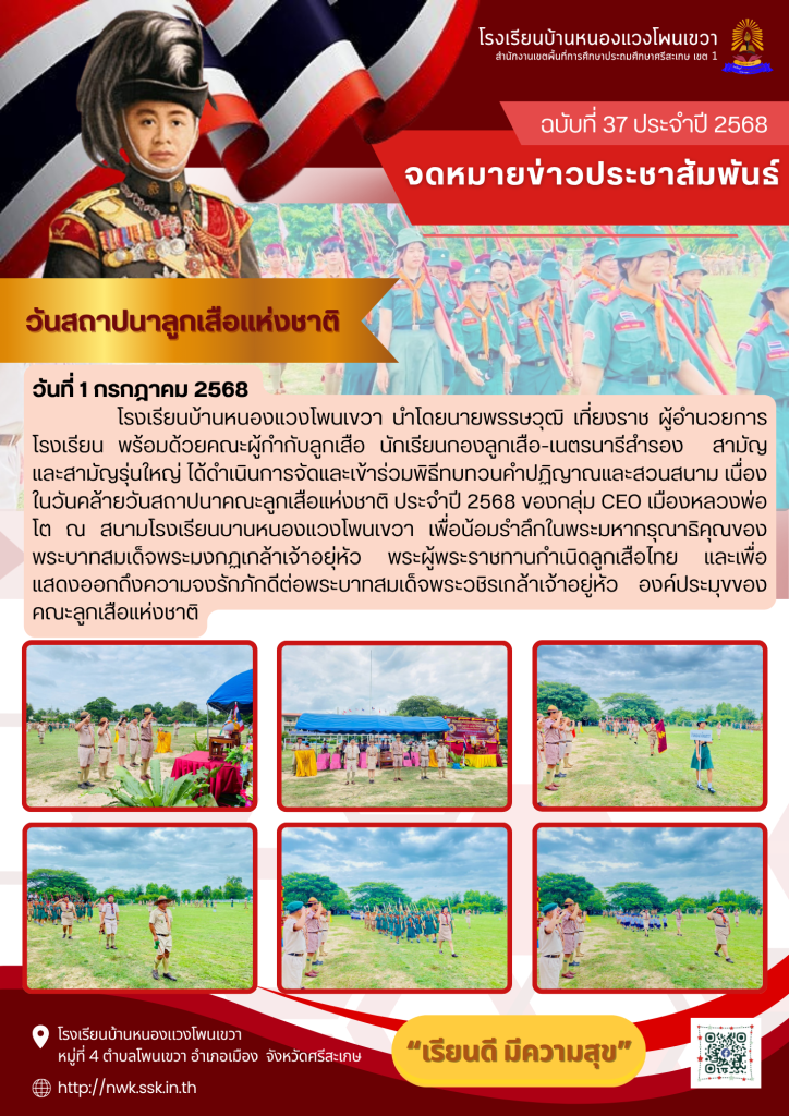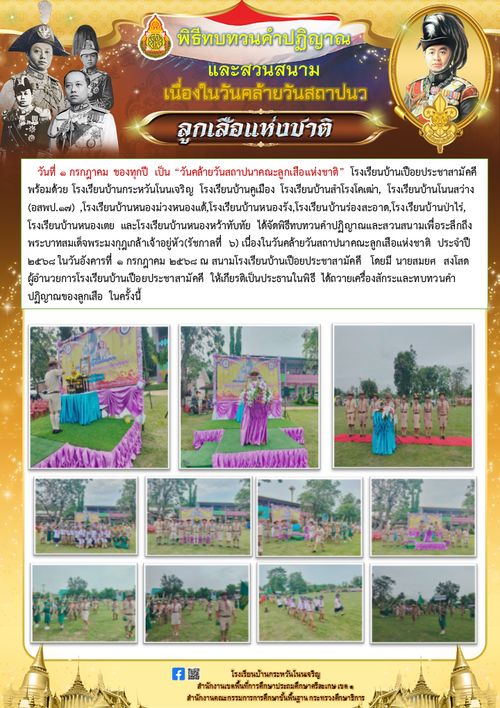 วันที่ 1 กรกฎาคม 2568 โรงเรียนบ้านหนองเตย นำโดยนางเฉลิมศรี วรรณทอง ผู้อำนวยการโรงเรียน คณะครูเเละบุคลากรทางการศึกษา นำนักเรียน เข้าร่วมเข้าร่วมพิธีเนื่องในวันคล้ายวันสถาปนาคณะลูกเสือแห่งชาติ ประจำปี 2568 โดยมีวัตถุประสงค์เพื่อระลึกถึงพระบาทสมเด็จพระมงกุฎเกล้าเจ้าอยู่หัว (รัชกาลที่ 6) ณ สนามโรงเรียนบ้านเปือยประชาสามัคคี