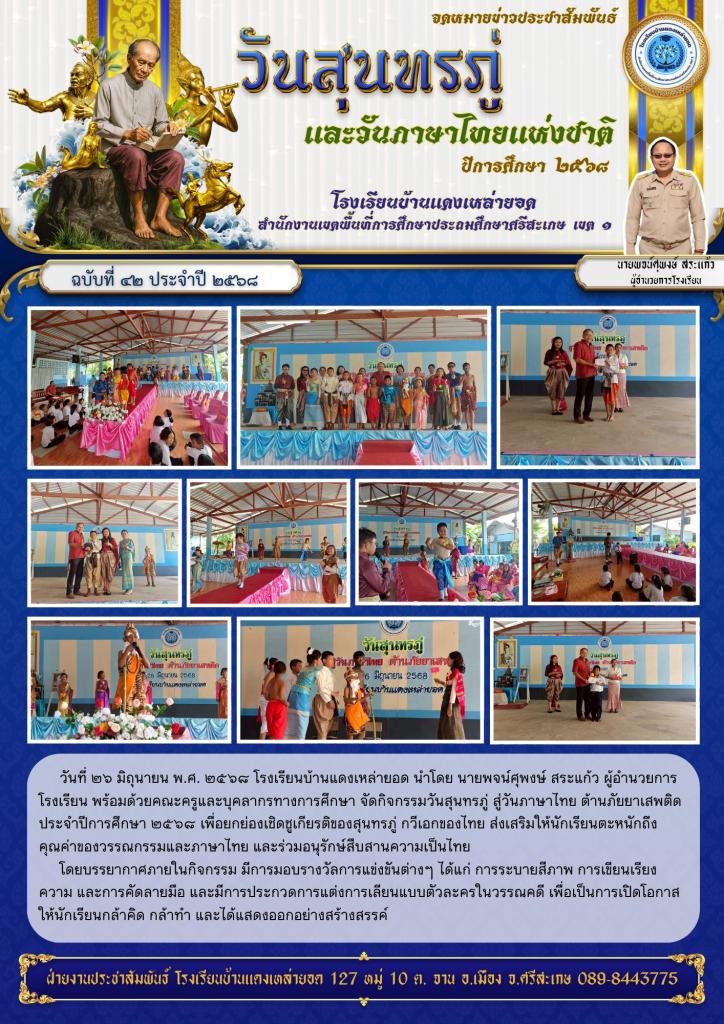 เมื่อวันพฤหัสบดีที่ ๒๖ มิถุนายน ๒๕๖๘ นางรุ่งรัตน์ สหัสดี ผู้อำนวยการโรงเรียนบ้านซำโพธิ์ พร้อมด้วยคณะครู บุคลากร และนักเรียน จัดกิจกรรมรำลึกวันสุนทรภู่และ วันภาษาไทย ประจำปีการศึกษา ๒๕๖๘ โดยมีการประกวดวาดภาพระบายสี คัดลายมือ แต่งกายเลียนแบบตัวละคร เพื่อส่งเสริมให้นักเรียนได้ตระหนักถึงคุณค่าของภาษาไทย อันเป็นภาษาประจำชาติ และร่วมกันอนุรักษ์ความเป็นไทย