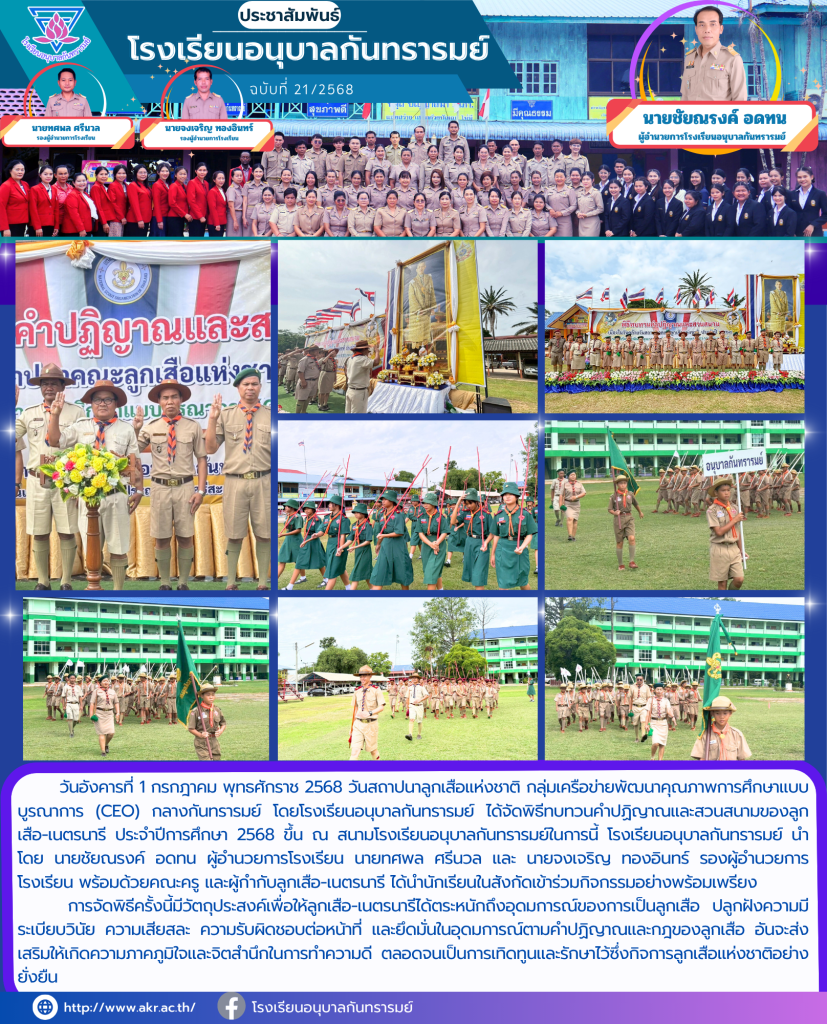 วันอังคารที่ 1 กรกฎาคม พุทธศักราช 2568 วันสถาปนาลูกเสือแห่งชาติ กลุ่มเครือข่ายพัฒนาคุณภาพการศึกษาแบบบูรณาการ (CEO) กลางกันทรารมย์ โดยโรงเรียนอนุบาลกันทรารมย์ ได้จัดพิธีทบทวนคำปฏิญาณและสวนสนามของลูกเสือ-เนตรนารี ประจำปีการศึกษา 2568 ขึ้น ณ สนามโรงเรียนอนุบาลกันทรารมย์ในการนี้ โรงเรียนอนุบาลกันทรารมย์ นำโดย นายชัยณรงค์ อดทน ผู้อำนวยการโรงเรียน นายทศพล ศรีนวล และ นายจงเจริญ ทองอินทร์ รองผู้อำนวยการโรงเรียน พร้อมด้วยคณะครู และผู้กำกับลูกเสือ-เนตรนารี ได้นำนักเรียนในสังกัดเข้าร่วมกิจกรรมอย่างพร้อมเพรียง